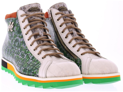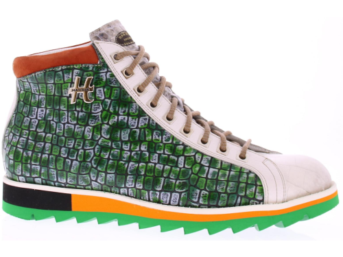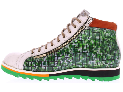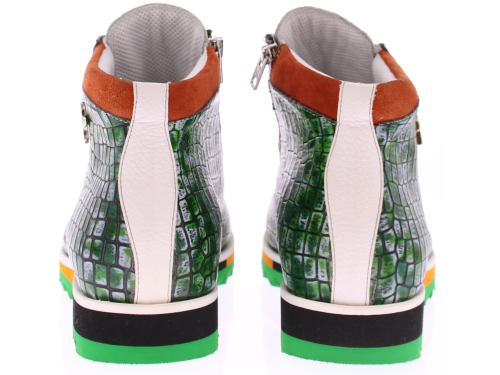 Heren enkelboot sneaker van Harris in een groen wit oranje combinatie van materialen op een groen rubber zool. De schoen heeft een rits in de zijkant om de instap makelijker te maken.