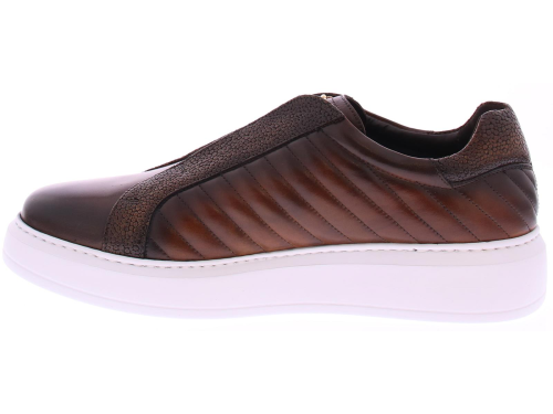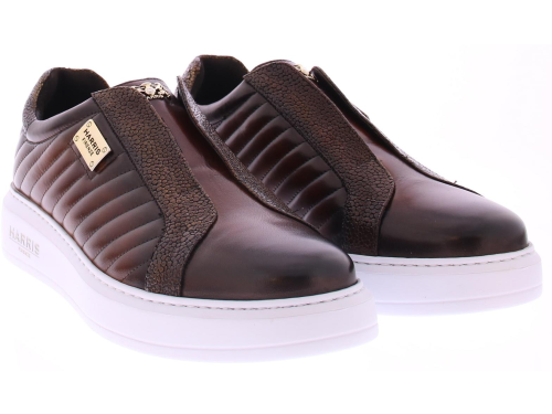 Heren sneaker van Harris, model snap on. De schoen heeft 2 lange elastieken in plaats van veters en is gemaakt van glad kalfsleer met roggen-print leer. De voering is van leer en de zool van wit rubber.
