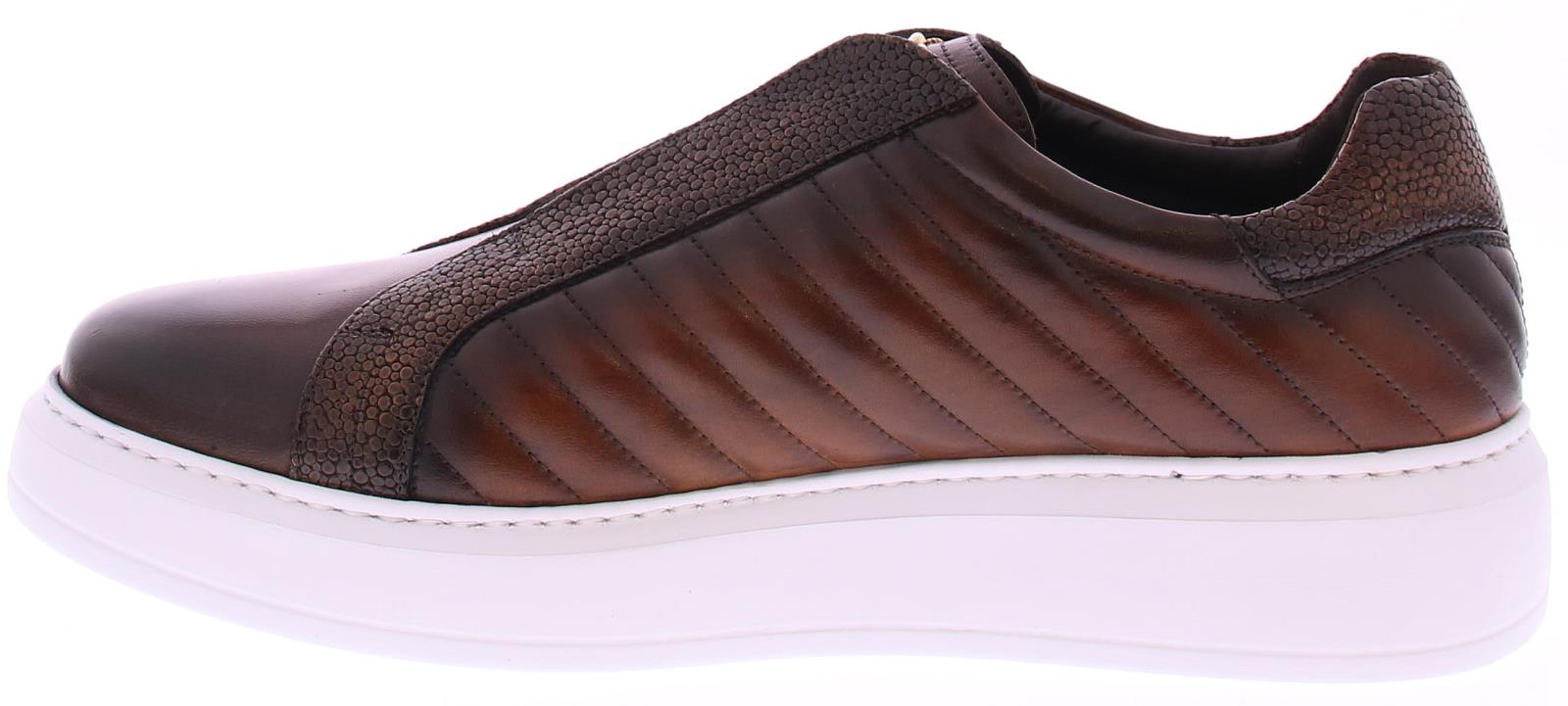 Heren sneaker van Harris, model snap on. De schoen heeft 2 lange elastieken in plaats van veters en is gemaakt van glad kalfsleer met roggen-print leer. De voering is van leer en de zool van wit rubber.
