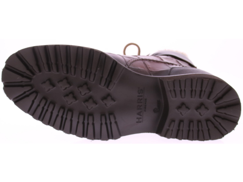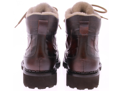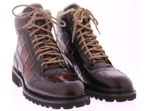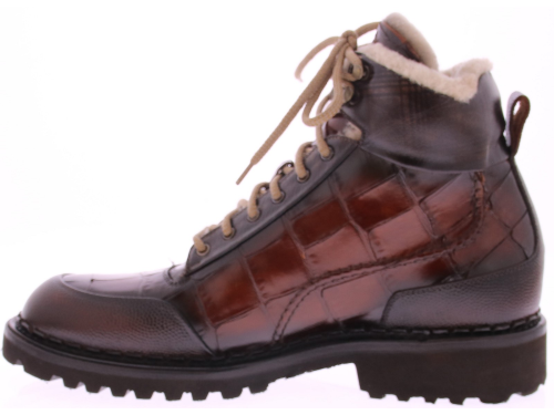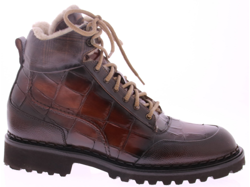 Deze robuuste maar verfijnde bergboot van Harris, model 0741, combineert het beste van traditioneel vakmanschap met luxueuze materialen. De schoen is vervaardigd van premium kalfsleer in een diepe, handgepoetste cognactint met een opvallend krokodillenreliëf. De manchet heeft een ruitjes print in het leer. Elke paar is uniek dankzij de ambachtelijke afwerking en het genuanceerde kleurverloop. De binnenzijde is gevoerd met zachte lamsvacht, wat zorgt voor een warm, behaaglijk gevoel tijdens koude dagen. De klassieke bergbootsluiting met metalen veterogen en stevige, beige veters draagt bij aan de authentieke outdoor-look, terwijl de massieve profielzool optimale grip en stabiliteit biedt – zowel in de stad als in de natuur. Deze Harris bergboot is de ideale keuze voor de stijlvolle man die ook in de winter geen concessies doet aan elegantie. De combinatie van luxe leer, warme voering en stoer silhouet maakt dit model tot een statement in elk wintergarderobe.