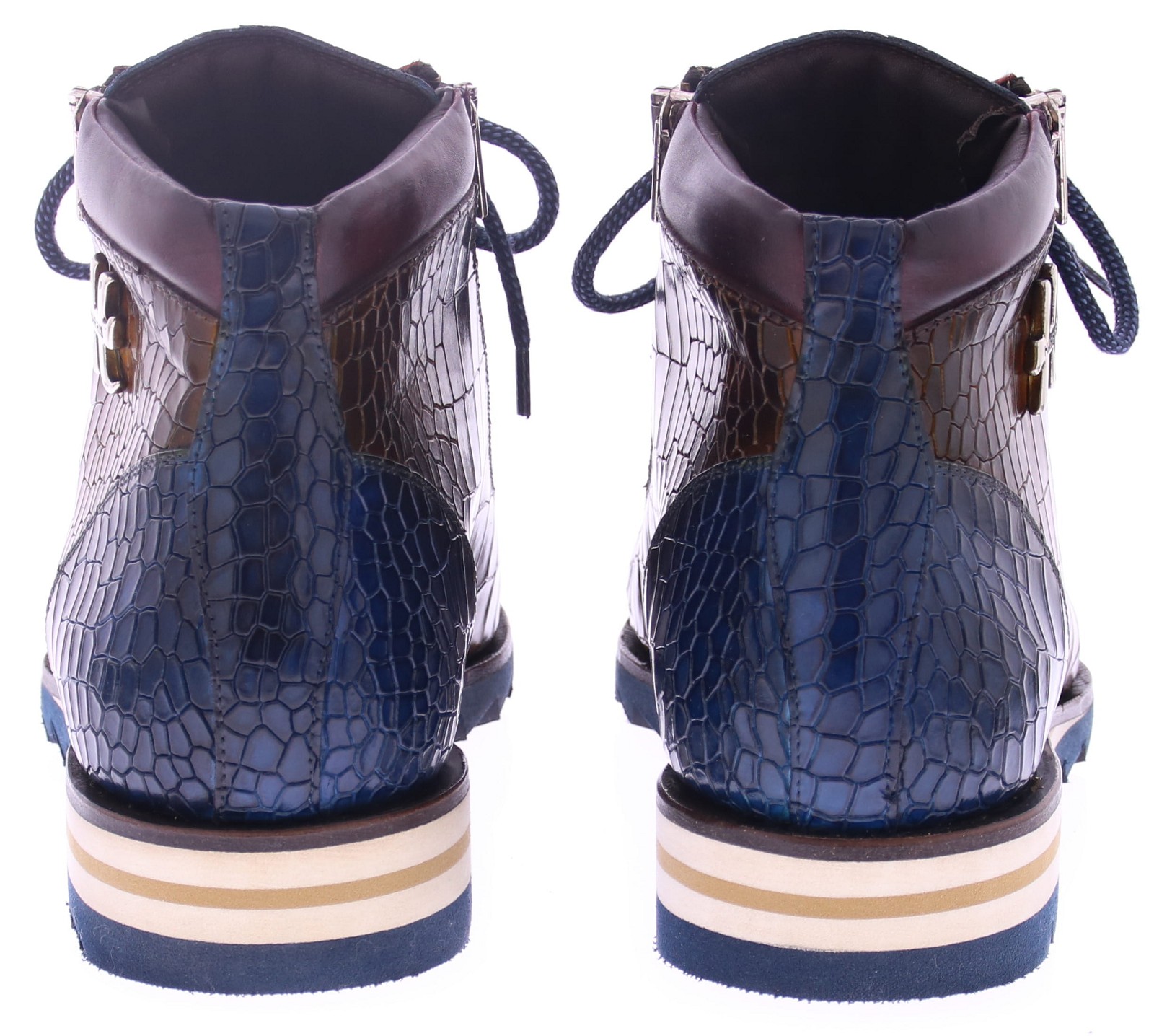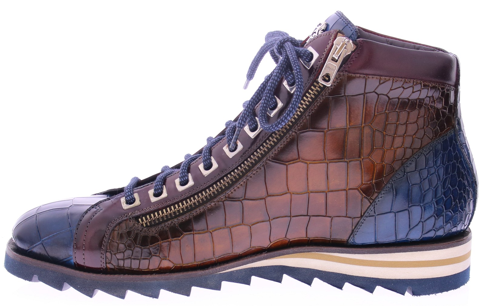 Deze stijlvolle Harris herenboot is een opvallende combinatie van klassiek vakmanschap en modern design. De schoen is vervaardigd uit glanzend kalfsleer met crocoprint, met een subtiele kleurverloop van diepblauw naar warmbruin. Het leer is met de hand gepolijst voor een unieke finish. De zijkant is voorzien van een functionele rits, wat het instappen gemakkelijk maakt. Donkerblauwe veters, een sportieve zool met witte en beige accenten, en het metalen Harris-logo zorgen voor een luxe, sportieve uitstraling.