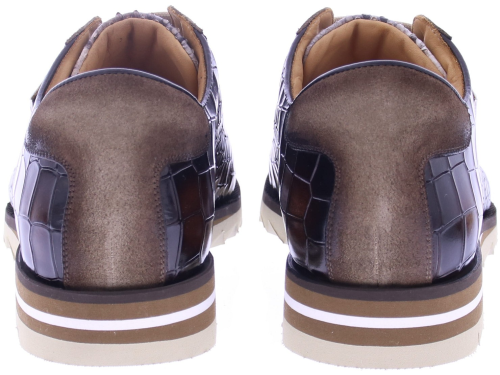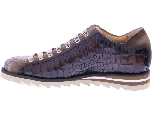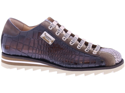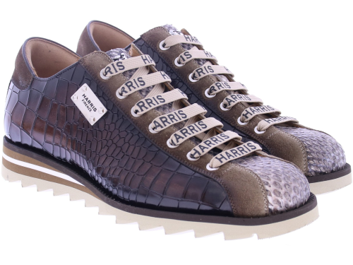 Deze opvallende lage sneaker van Harris is een stijlstatement op zich. Het bovenwerk is vervaardigd van luxe kalfsleer met crocoprint, gecombineerd met een neus van pythonstructuur en suède accenten voor een rijke, gelaagde uitstraling. De karakteristieke Harris-logo-veters en het metalen plaatlogo aan de zijkant geven de schoen een exclusieve touch. De sportieve zool met kartelrand en kleuraccenten biedt niet alleen comfort, maar ook een moderne look. Deze schoen is met de hand gemaakt in Italië en belichaamt de perfecte mix van traditioneel vakmanschap en eigentijds design – ideaal voor de modebewuste man.