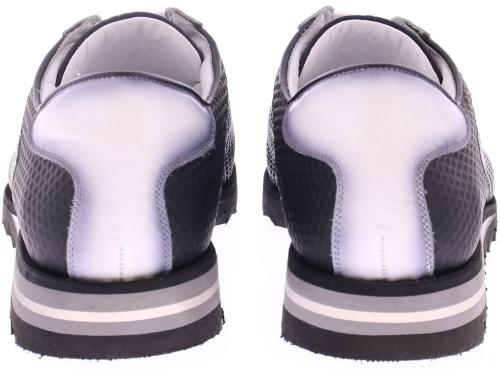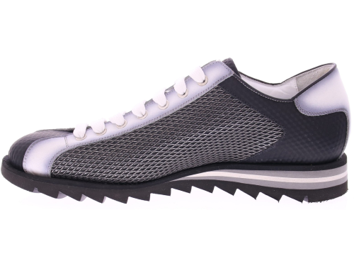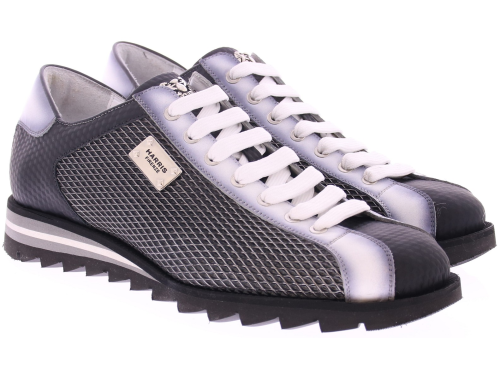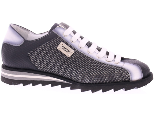 Deze exclusieve lage sneaker van Harris combineert sportieve luxe met modern Italiaans design. De schoen is uitgevoerd met een opvallend zilver-metallic mesh zijpaneel, stijlvol gecombineerd met glad wit leer en mat zwart leer met carbonprint. Het metalen Harris Firenze-logo aan de zijkant versterkt de high-end uitstraling van deze sneaker. De lichtgewicht zool met kartelprofiel zorgt voor comfort én grip bij dagelijks gebruik. Deze sneaker is een statement-item voor de man die houdt van vernieuwende materialen, geraffineerde details en een sportieve, elegante look.