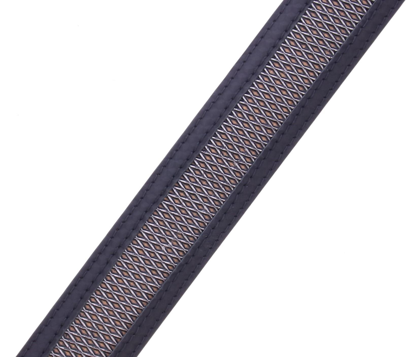 Zwart leren heren riem van Harris uitgevoerd met een opvallend zilver-metallic mesh zijpaneel, stijlvol gecombineerd met glad wit leer en mat zwart leer met carbonprint.De riem is in te korten aan de gespkant en is passend bij een schoen uit onze collectie met artikelnummer44156.