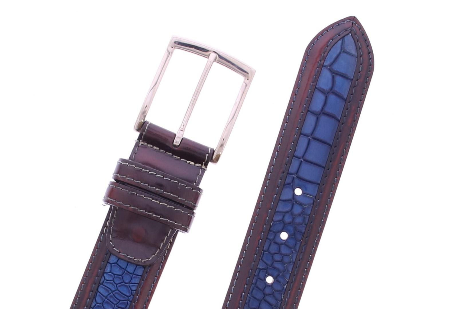Blauw met bordeaux leren heren riem van Harris, uitgevoerd in luxe kalfsleer met crocoprint. De riem is in te korten aan de gespkant en is passend bij een schoen uit onze collectie met artikelnummer 44154.