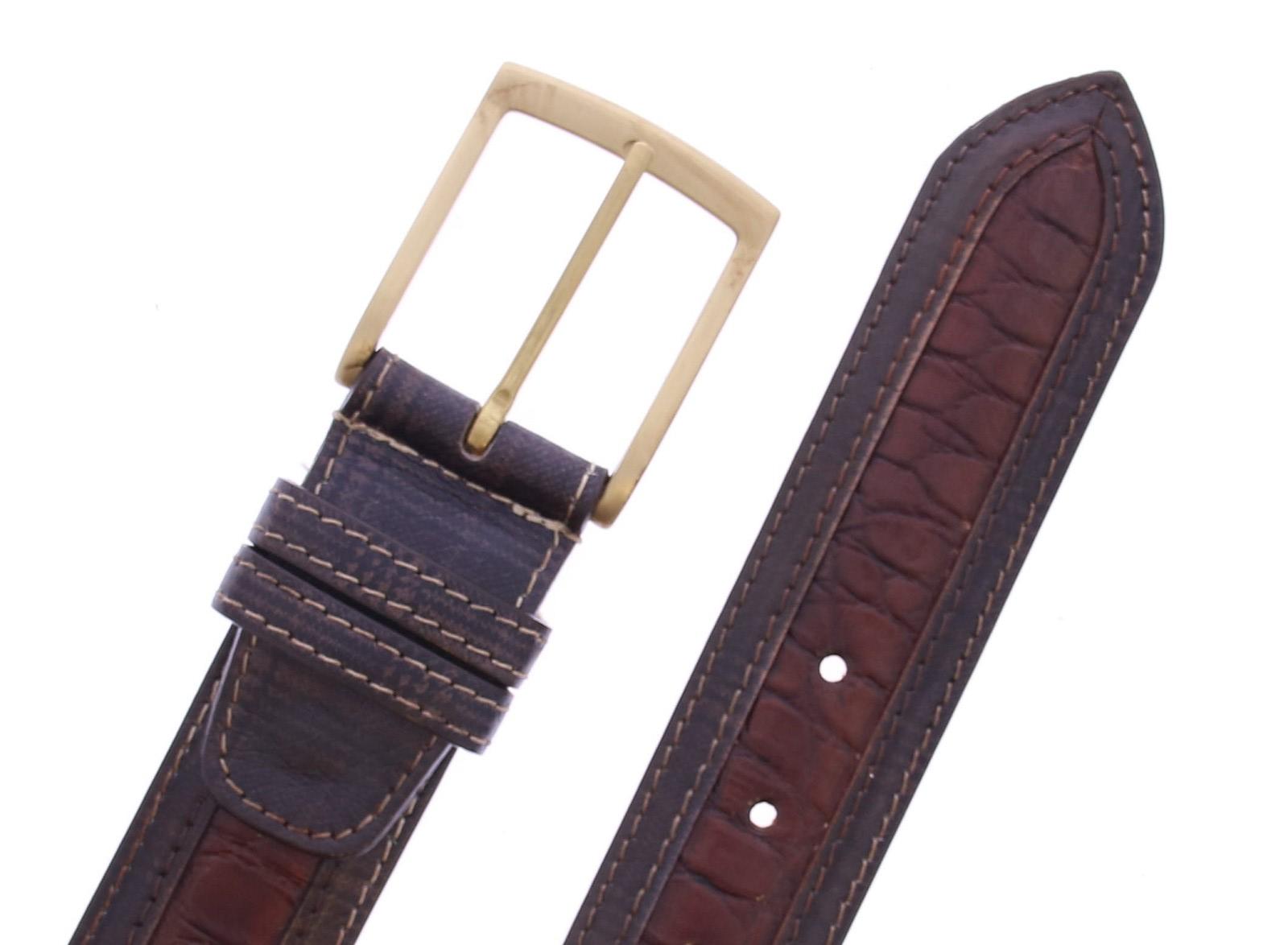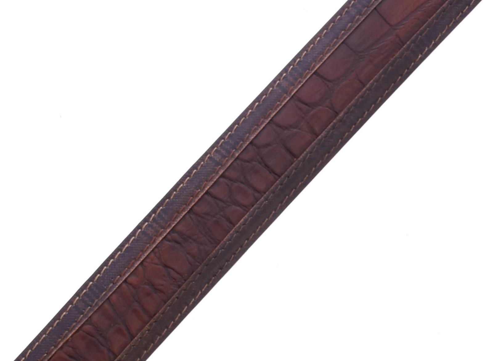 Donkerbruin leren heren riem van Harris, uitgevoerd in luxe kalfsleer met crocoprint. De riem is in te korten aan de gespkant en is passend bij een schoen uit onze collectie met artikelnummer 44150.