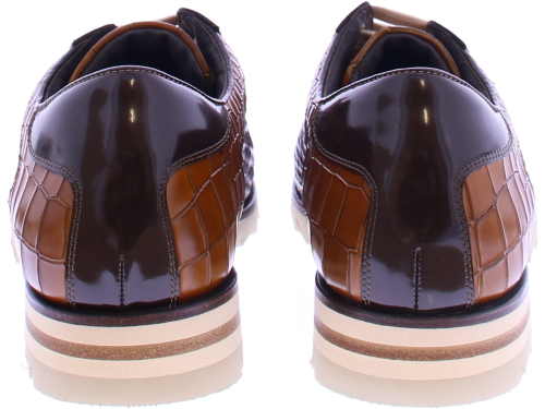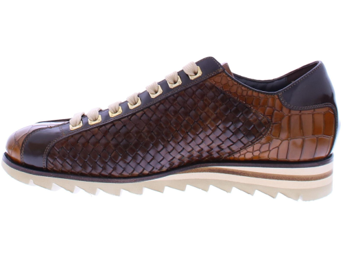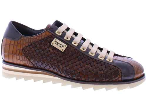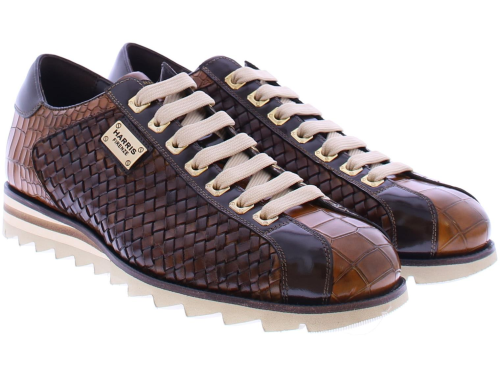 Bruine leren heren sneaker van Harris. Deze sneaker is uitgevoerd in bruin gevlochten leer met een donker bruine leren tong. De sneaker komt op een beige rubberen haaientand zool.