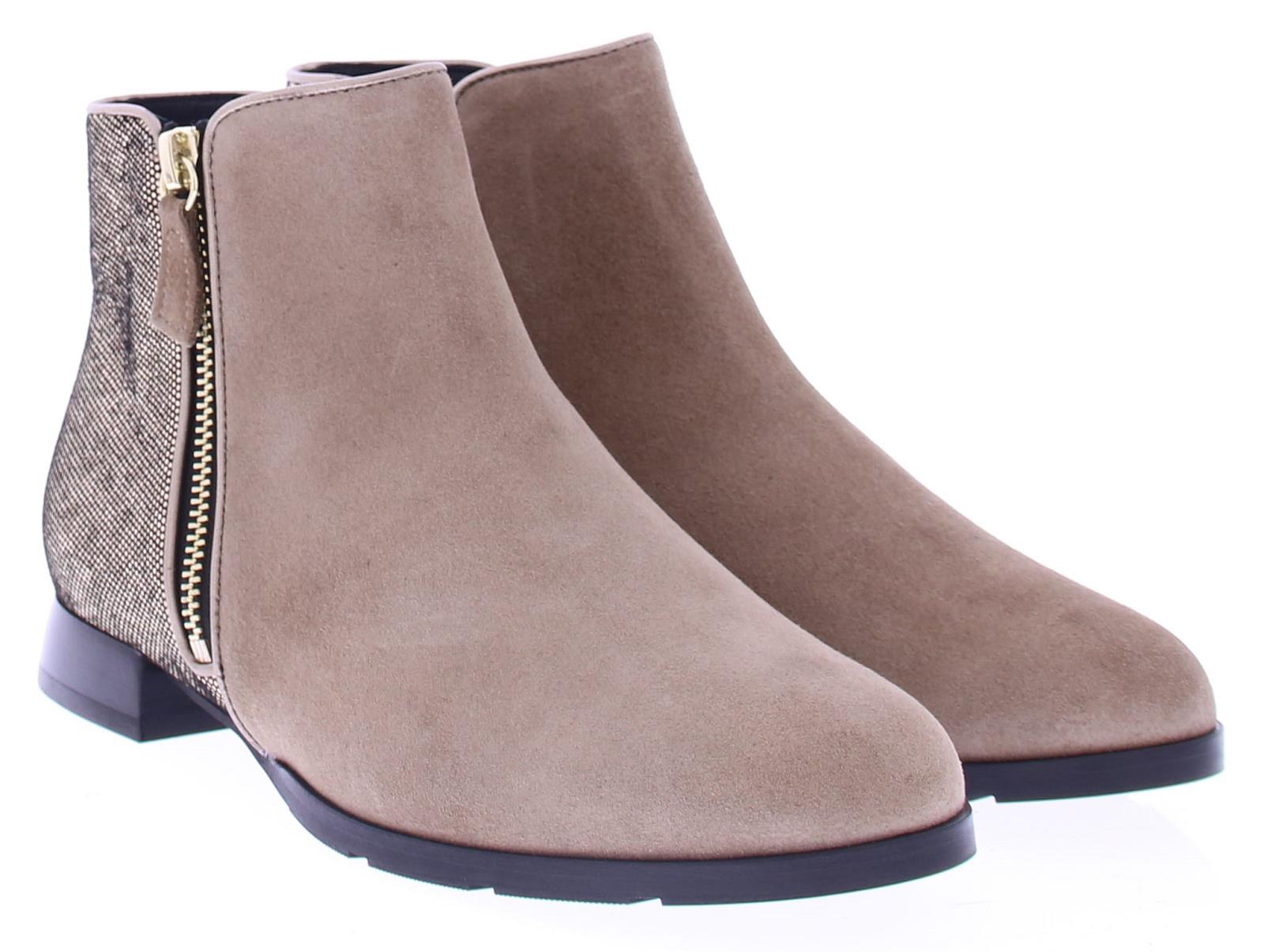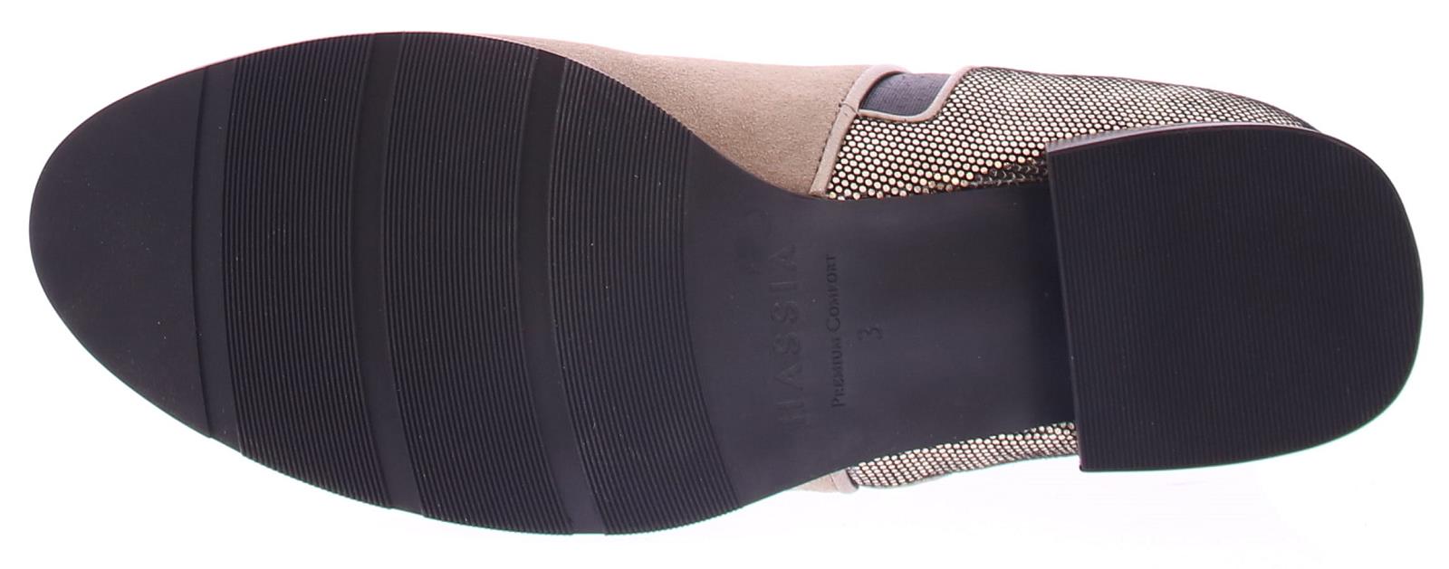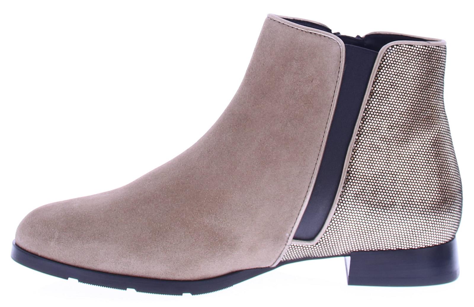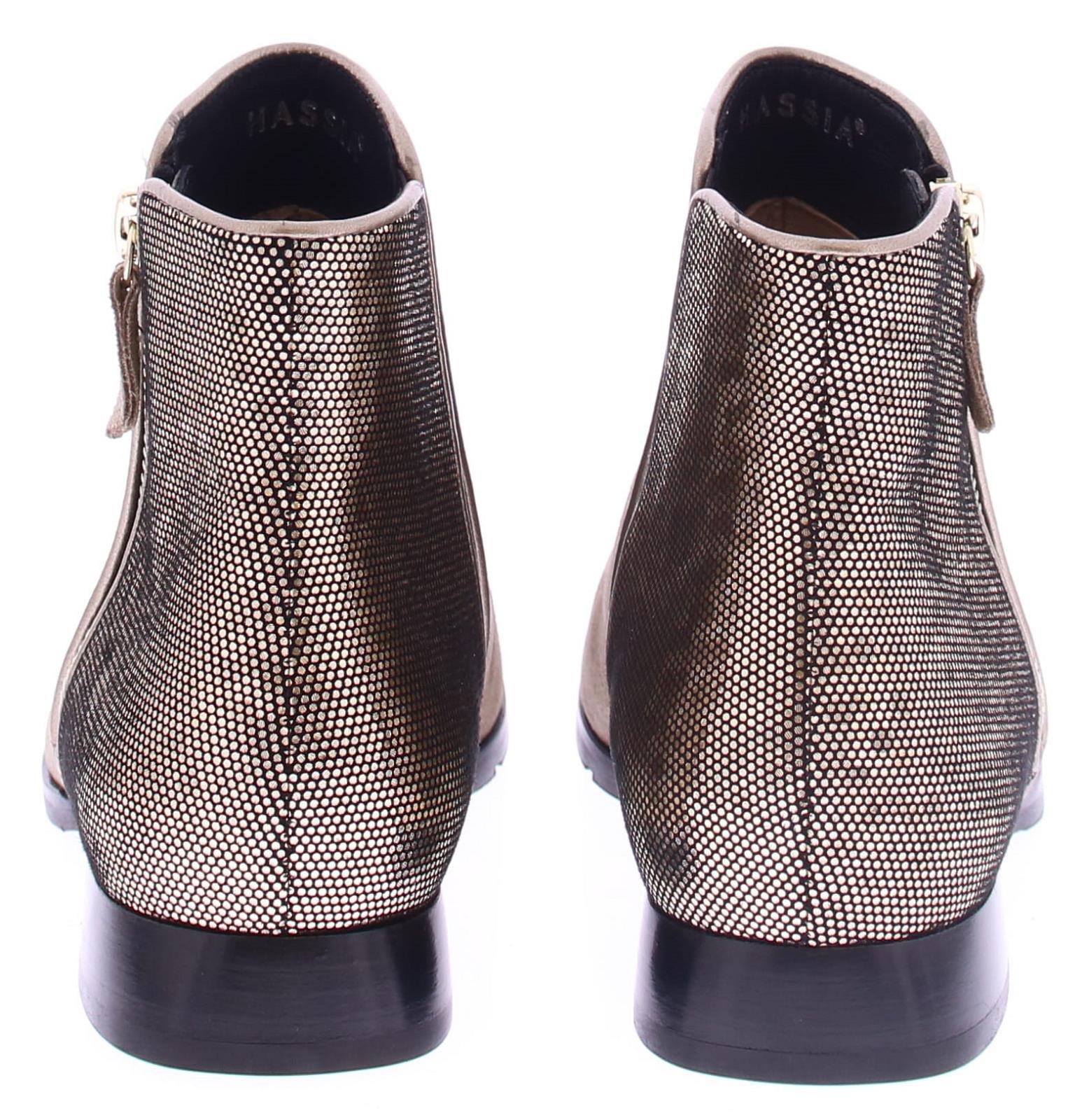 Beige suede korte dames laars van Hassia. Dit laarsje heeft een achterkant van metallic leer met een ruitjes motief. Opvallend detail is de ritssluiting aan de buitenkant van het laarsje, dat ziet er niet alleen erg leuk uit maar is ook nog eens praktisch met het aan- en uittrekken van de laars. De voering is gemaakt van leer en het voetbed is uitneembaar.