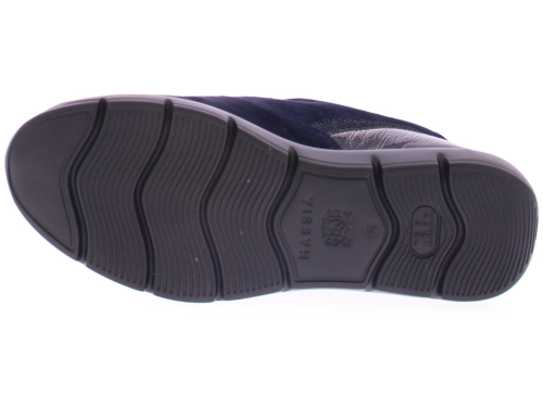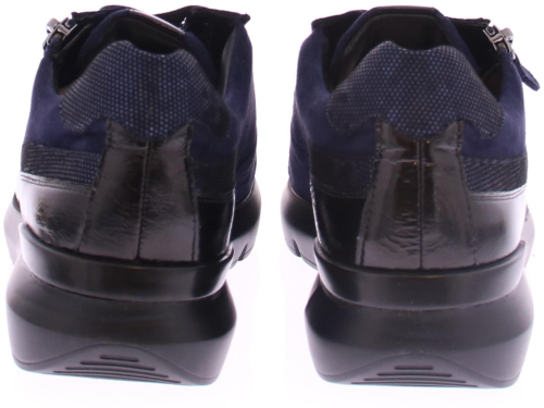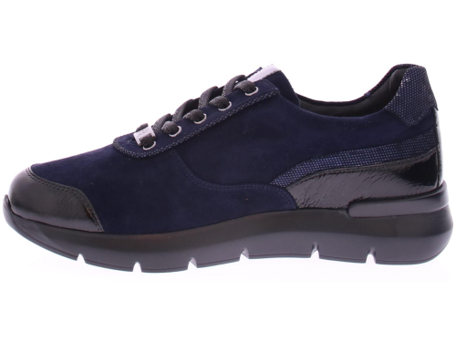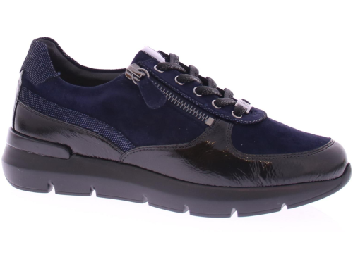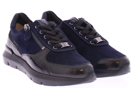 Donkerblauw leren dames sneaker van Hassia. Deze sneaker is uitgevoerd in een combinatie van blauw suede en zwart lak leer. Het ritsje naast de veter maakt het aan en uit trekken gemakkelijk. De breedte is H en de binnenzool is uitneembaar.