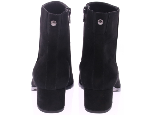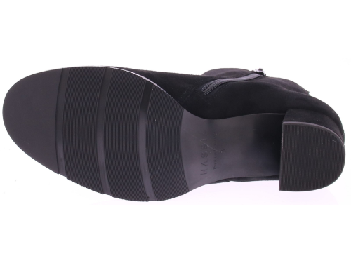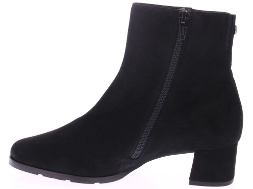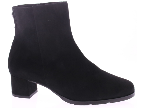 Zwart suede dames enkellaars van Hassia. Uitgevoerd op een H-wijdte met uitneembaar voetbed. Aan de binnenkant zit een rits en de comfortabele blokhak is 4 cm. Mooi kort basislaarsje voor een bredere voet en geschikt voor de eigen inlegzool.