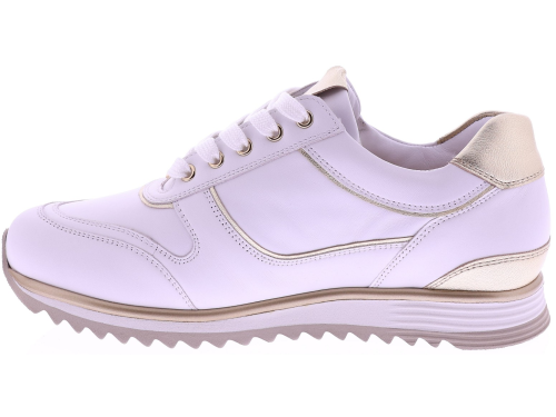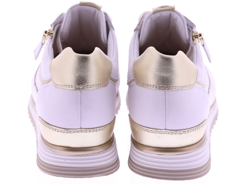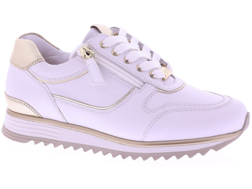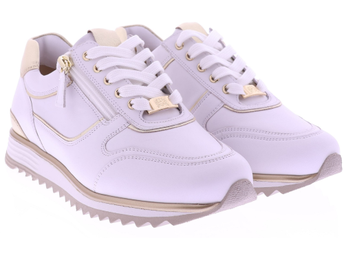 Witte leren dames sneakers van Hassia. Model 1-30 1350-0299 is uitgevoerd in zacht leer met gouden accenten voor een frisse en moderne uitstraling. Dankzij de H-leest biedt dit model extra ruimte en een comfortabele pasvorm. De rits naast de veters zorgt voor een makkelijke instap. Het uitneembare voetbed maakt de sneaker geschikt voor eigen inlegzolen en de lichte zool zorgt voor prettig draagcomfort, de hele dag door. Leuk bij een jeans, rok of een sportieve jurk. Ontdek ook de andere modellen van Hassia bij Klijsen Schoenmode.