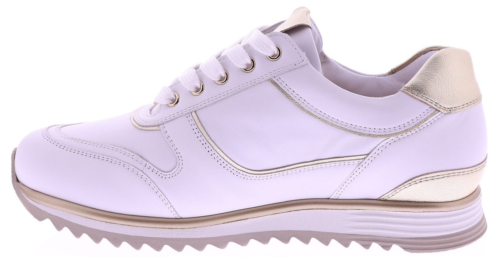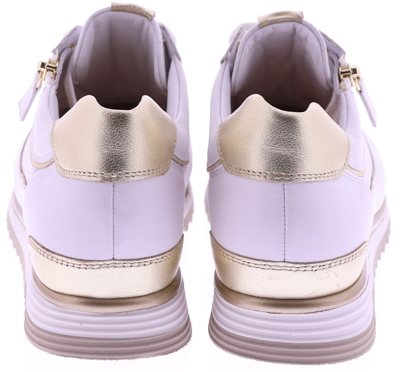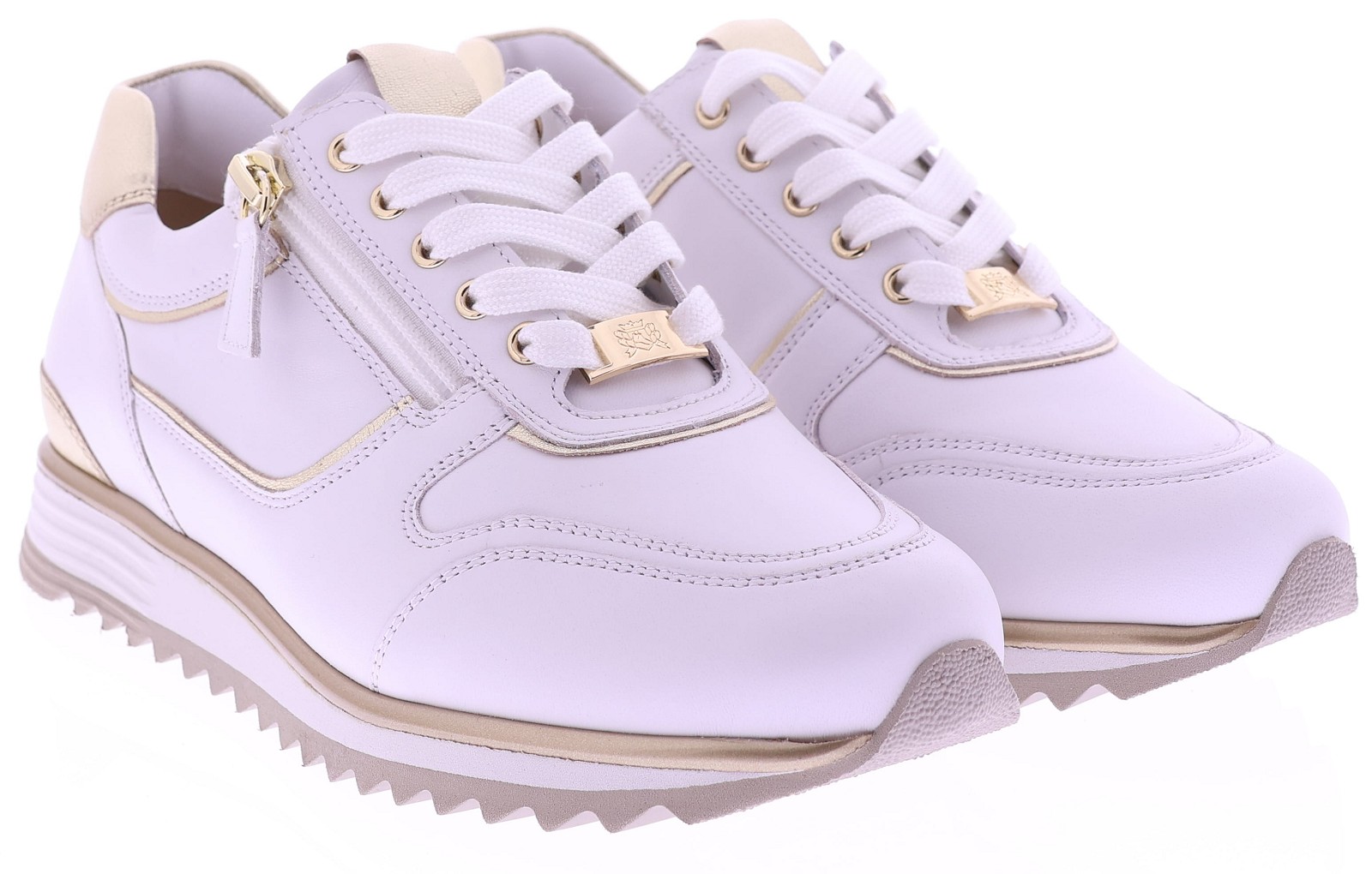 Witte leren dames sneakers van Hassia. Model 1-30 1350-0299 is uitgevoerd in zacht leer met gouden accenten voor een frisse en moderne uitstraling. Dankzij de H-leest biedt dit model extra ruimte en een comfortabele pasvorm. De rits naast de veters zorgt voor een makkelijke instap. Het uitneembare voetbed maakt de sneaker geschikt voor eigen inlegzolen en de lichte zool zorgt voor prettig draagcomfort, de hele dag door. Leuk bij een jeans, rok of een sportieve jurk. Ontdek ook de andere modellen van Hassia bij Klijsen Schoenmode.