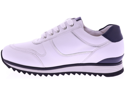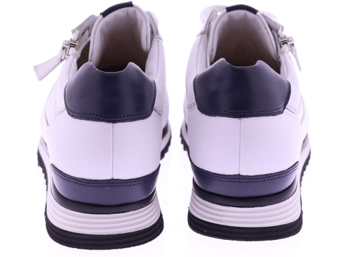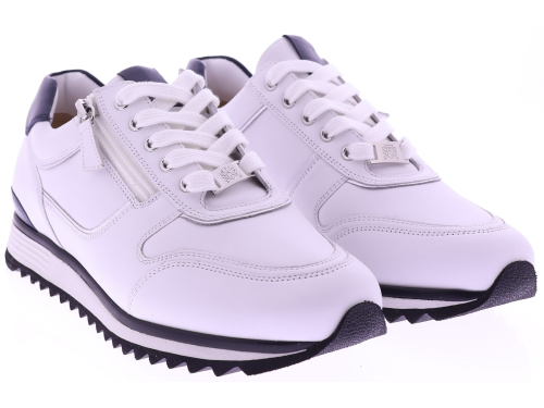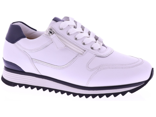 Witte leren dames sneakers van Hassia. Model 1-30 1350-0235 is uitgevoerd in zacht leer met donkeblauwe accenten voor een frisse en moderne uitstraling. Dankzij de H-leest biedt dit model extra ruimte en een comfortabele pasvorm. De rits naast de veters zorgt voor een makkelijke instap. Het uitneembare voetbed maakt de sneaker geschikt voor eigen inlegzolen en de lichte zool zorgt voor prettig draagcomfort, de hele dag door. Leuk bij een jeans, rok of een sportieve jurk. Ontdek ook de andere modellen van Hassia bij Klijsen Schoenmode.