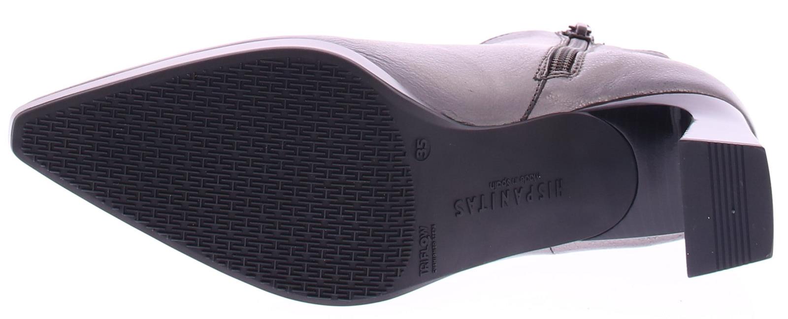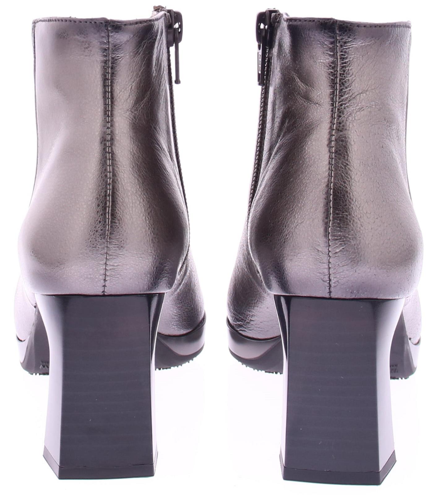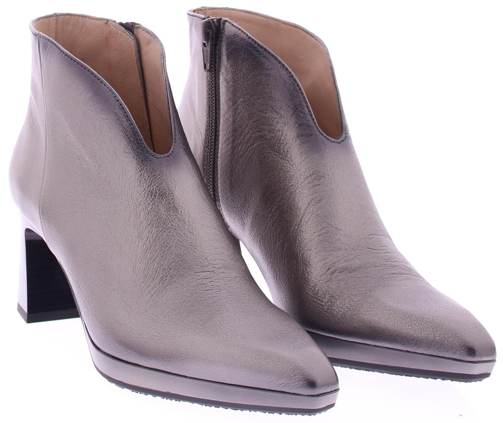 Platina kleur leren dames enkellaars van Hispanitas. Deze laars heeft een spitsere neus en een elegante v-uitsnijding. De hak is iets uitlopend en heeft een hoogte van 7 cm. Maak je outfit compleet en combineer dit leuke laarsje samen met een broek of jurk.