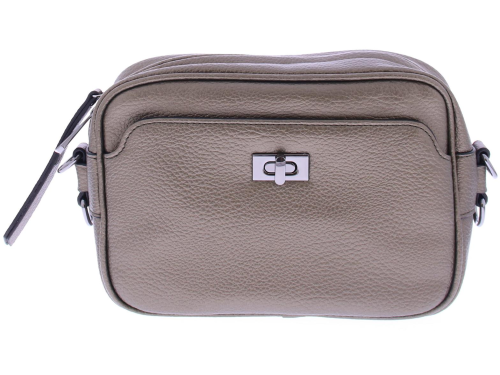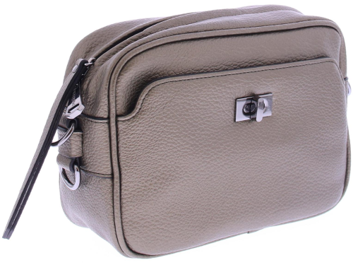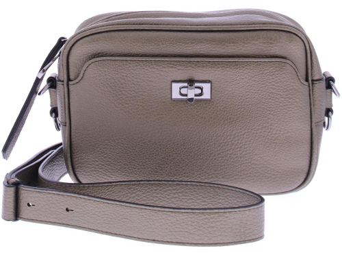 Bronskleurige leren dames tas van Hispanitas. De afmetingen van de tas zijn: 24 cm breed X 16 cm hoog x 9 cm diep. De tas heeft ook een lange brede schouderband die te stellen is. In de binnenkant zijn nog twee kleine vakjes te vinden en de tas sluit met een rits