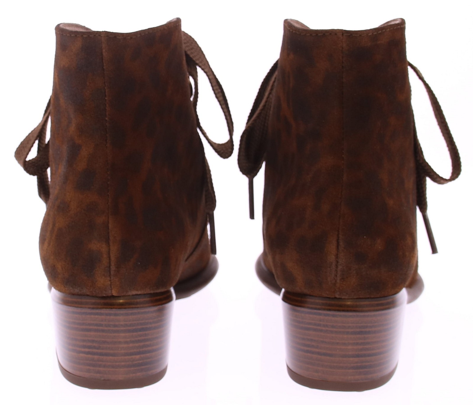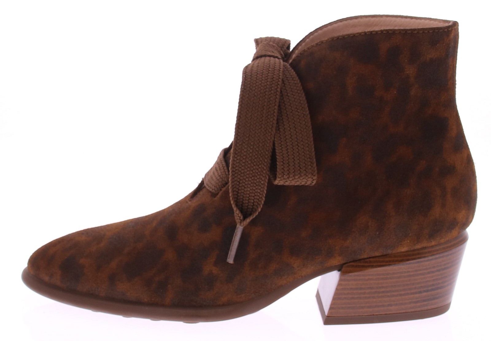Deze dames korte laars van Hispanitas combineert een gedurfde stijl met klassieke elegantie. Het bruine leopard printje geeft de laars een speelse en opvallende uitstraling, terwijl de brede veter een stoer accent toevoegt. De spitse neus en de iets schuine hak van 4 cm zorgen voor een verfijnde, vrouwelijke look die perfect balanceert tussen mode en comfort.