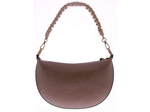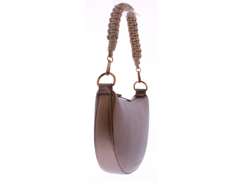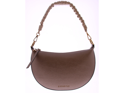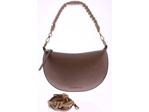 Bronskleurig vegan leren maanvormige tasje van Hispanitas. Het gevlochten handvat geeft de tas een speels karakter, terwijl het lange schouderhengsel zorgt voor praktisch draaggemak – of je ‘m nu in de hand draagt of crossbody. Dankzij het slimme ontwerp en de unieke vorm is dit tasje een echte eyecatcher.