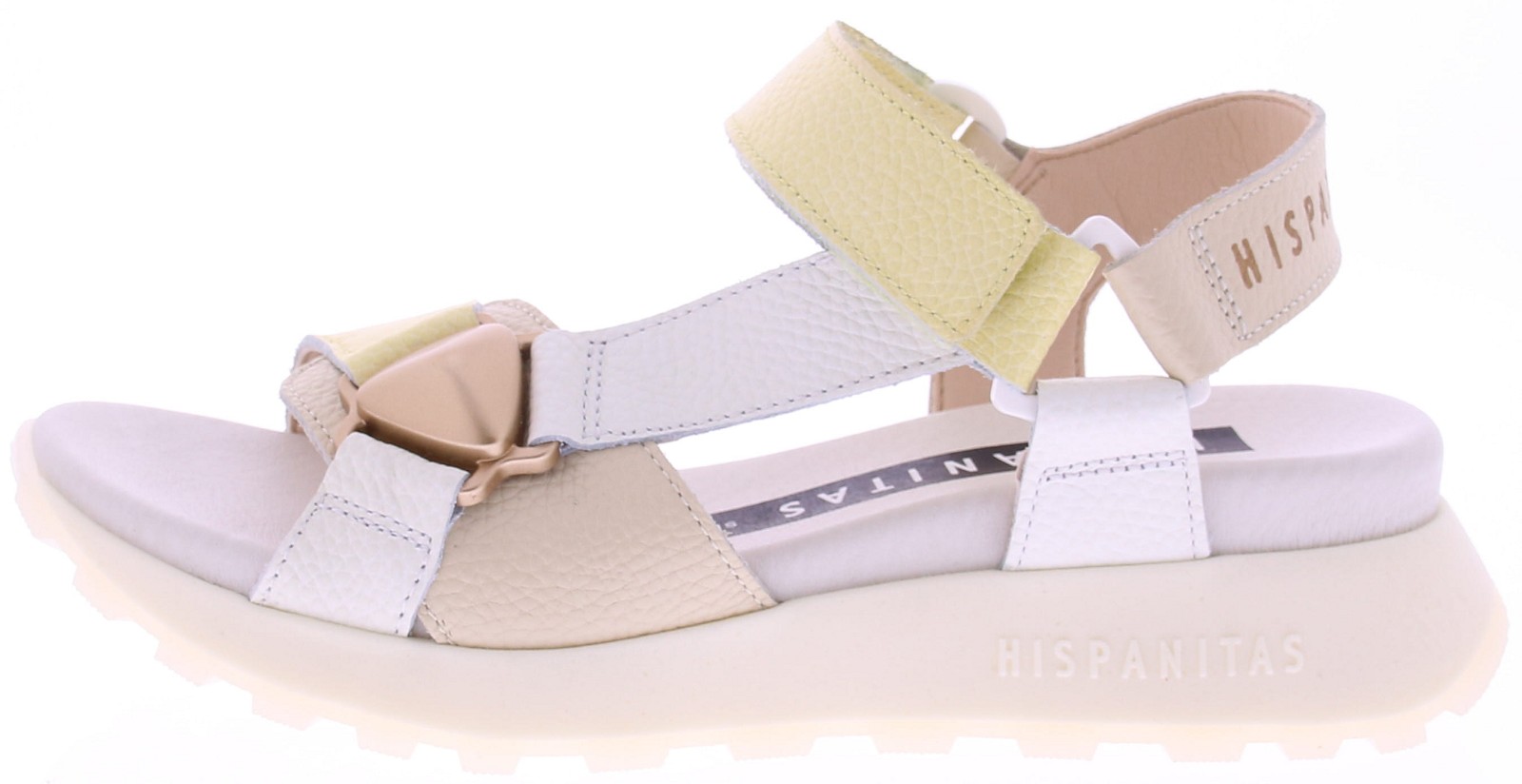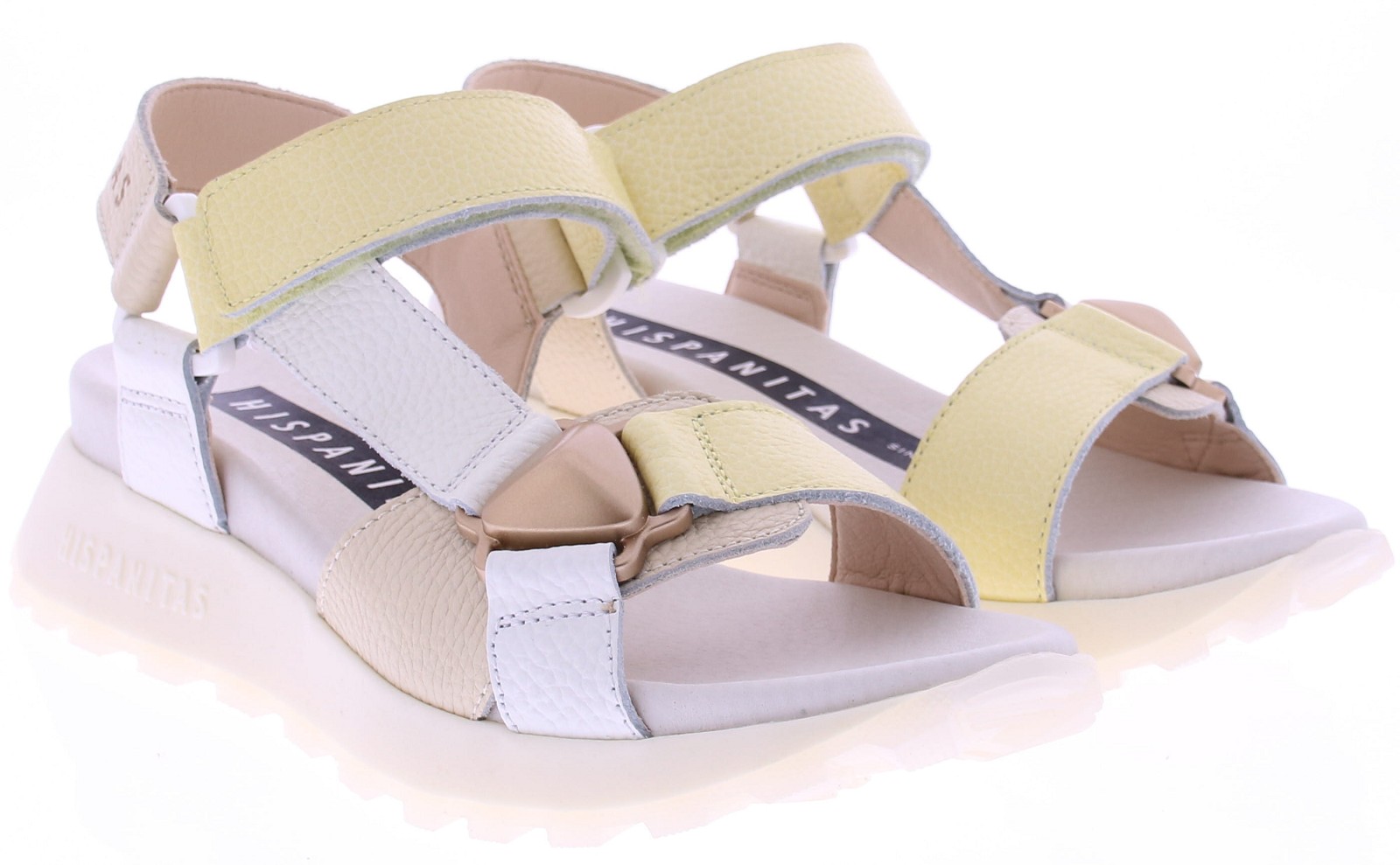 Wit, geel, beige leren dames sandalen van Hispanitas model Ambar Bolero panna. Deze sandalen combineren een frisse kleurstelling met een sportieve en eigentijdse uitstraling. Het zachte, comfortabele voetbed zorgt voor aangenaam draagcomfort, terwijl de stevige zool extra ondersteuning biedt tijdens het lopen. De leren banden sluiten mooi aan om de voet en de wreefband is te verstellen met klitteband. Een leuk model voor een zomerse look die perfect past bij zowel jurken als casual outfits. Ontdek ook de andere dames sandalen van Hispanitas bij Klijsen.