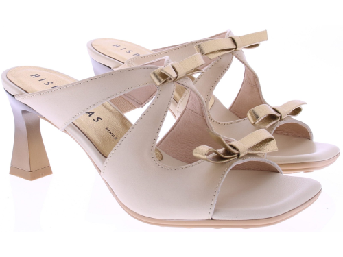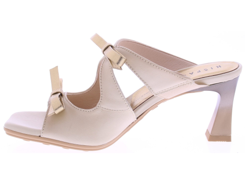 Roomkleurige leren dames muilen van Hispanitas model Rosa. Deze elegante muilen zijn uitgevoerd in soepel leer in een zachte roomtint en verfijnd afgewerkt met platina strikjes op de voorvoet. Het comfortabele voetbed zorgen voor prettig draagcomfort, terwijl de vrouwelijke hak van 6 cm het model een stijlvolle en verfijnde uitstraling geeft.