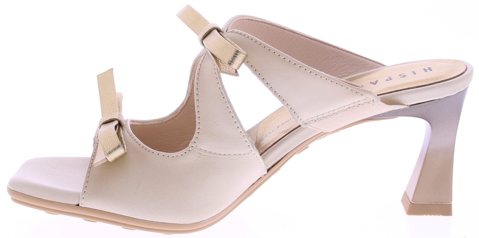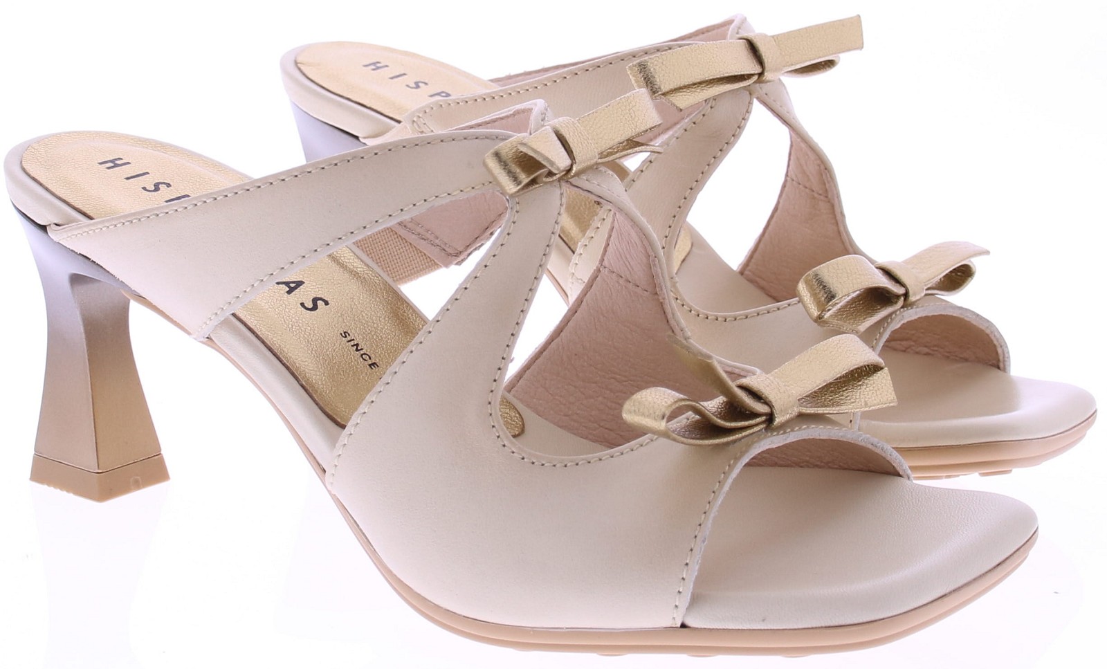 Roomkleurige leren dames muilen van Hispanitas model Rosa. Deze elegante muilen zijn uitgevoerd in soepel leer in een zachte roomtint en verfijnd afgewerkt met platina strikjes op de voorvoet. Het comfortabele voetbed zorgen voor prettig draagcomfort, terwijl de vrouwelijke hak van 6 cm het model een stijlvolle en verfijnde uitstraling geeft.