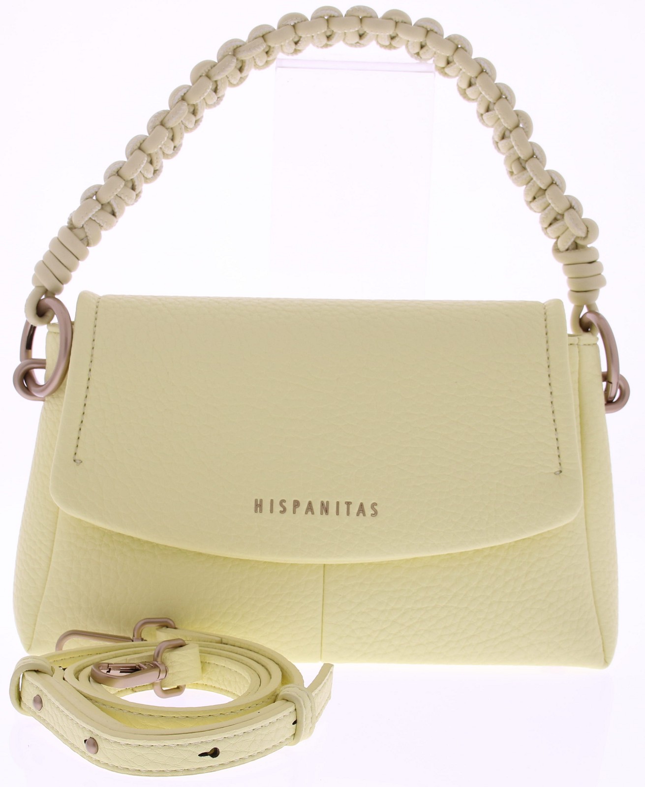 Geel PU leren dames tas van Hispanitas model Covent Panna samba panna. Deze elegante tas is uitgevoerd in fijn gestructureerd PU leer en afgewerkt met een decoratieve gevlochten schouderband die zorgt voor een speels en zomers accent. Het compacte model is stijlvol en praktisch en vormt een perfecte match met lichte zomerse outfits. Mooi te combineren met bijpassende schoenen uit onze collectie. Ontdek ook de andere dames tassen van Hispanitas bij Klijsen.