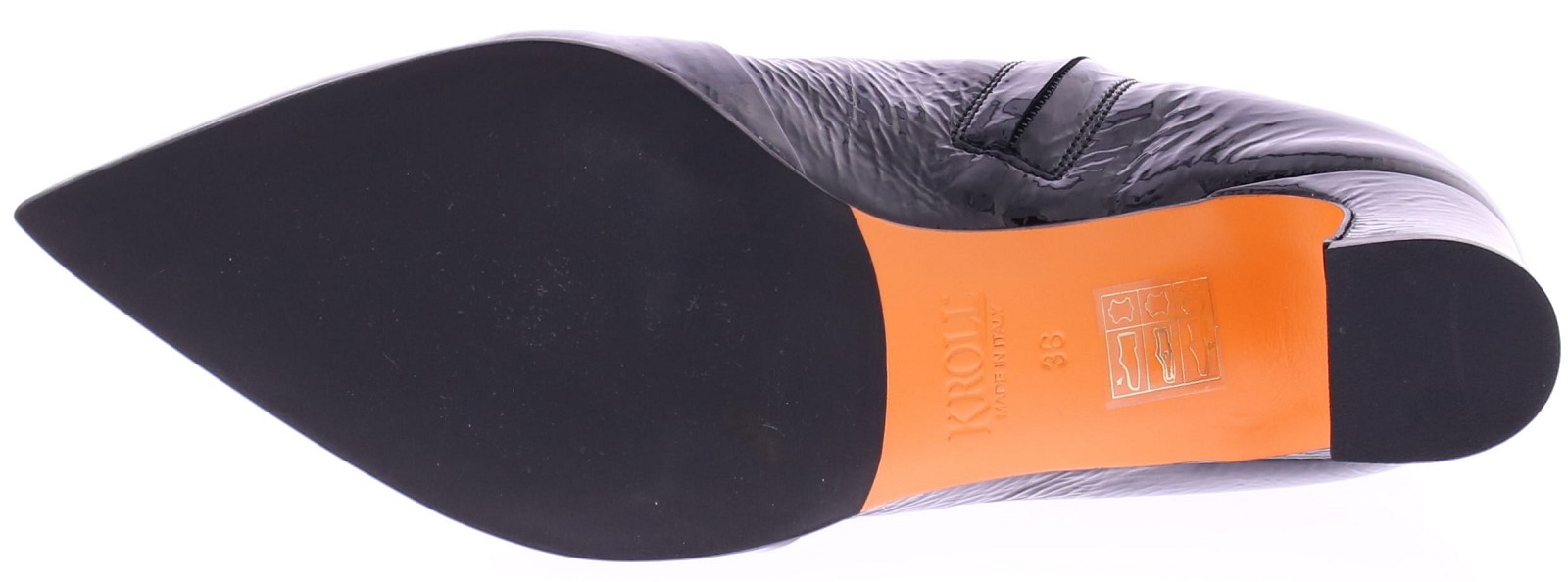 Zwart lakleren dames laars van Kroll. Deze stijlvolle dames laars combineert een elegante uitstraling met hoogwaardige materialen en verfijnde afwerking. De spitse leest en het glanzende bordeaux lakleer geven deze boots een chique, vrouwelijke look – ideaal voor zowel zakelijke als feestelijke gelegenheden. De schacht is ongeveer 14 cm hoog en voorzien van een handige ritssluiting aan de zijkant. Aan de binnenzijde zorgt soepel leer voor een luxe draaggevoel. De hak van circa 5 cm biedt een elegante lift zonder in te leveren op comfort. De rubberen zool zorgt daarbij voor grip en een prettige loopervaring.