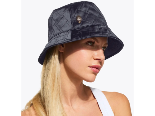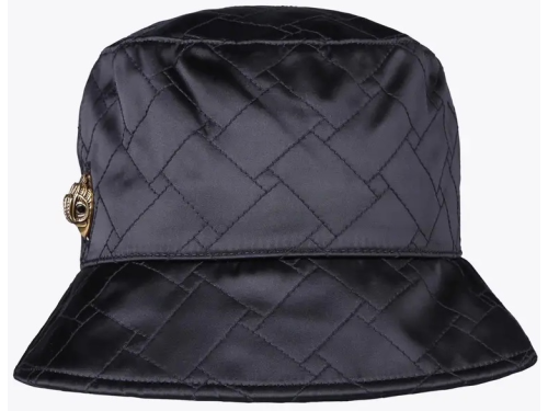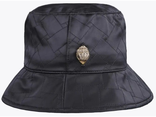 Zwart stoffen bucket hat voor dames van Kurt Geiger. Deze Bucket hat heeft eendoorgestikte quiltpatroon en een antieke gouden adelaarskop met gouden kristallen. Deze bucket hat is gemaakt van 100% polyester.