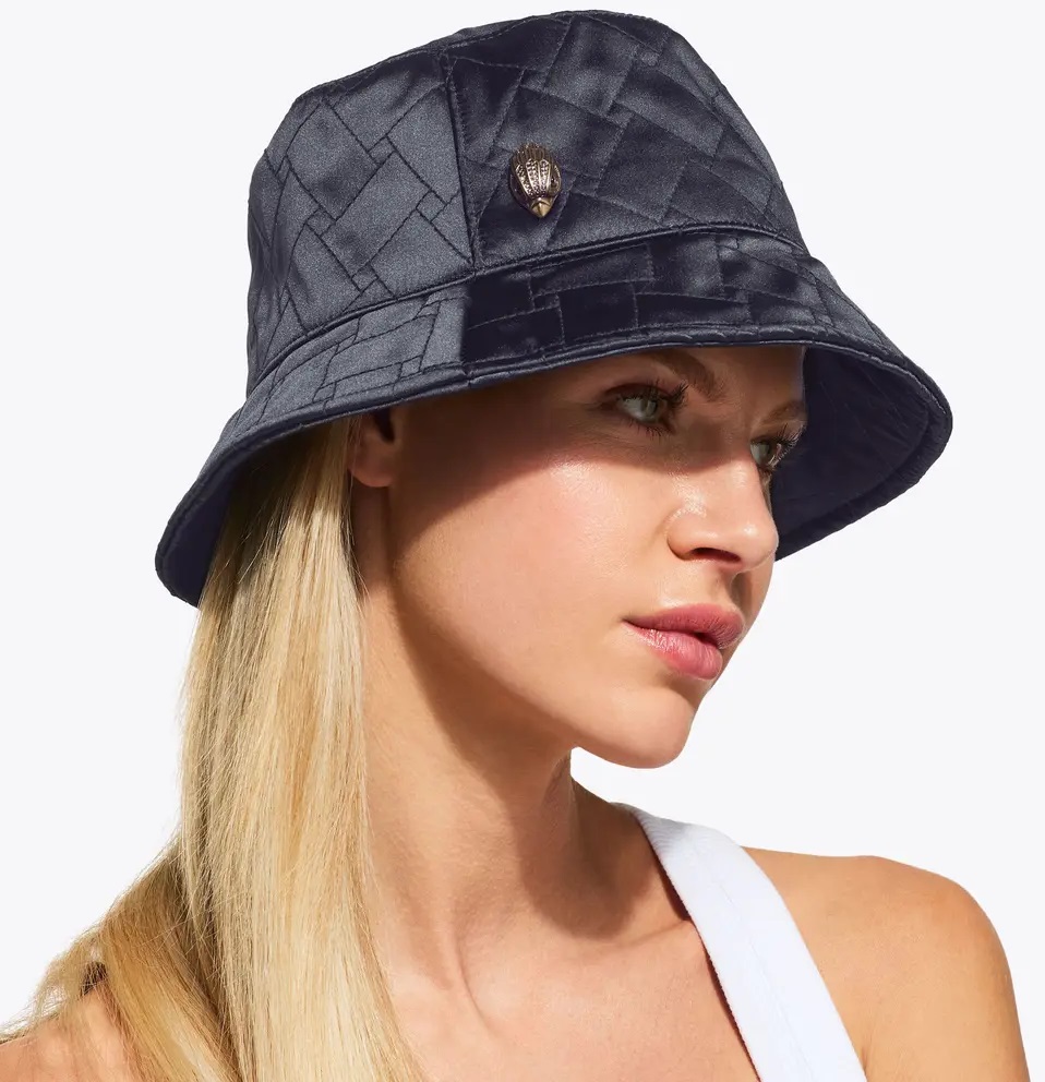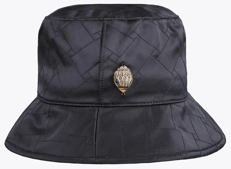 Zwart stoffen bucket hat voor dames van Kurt Geiger. Deze Bucket hat heeft eendoorgestikte quiltpatroon en een antieke gouden adelaarskop met gouden kristallen. Deze bucket hat is gemaakt van 100% polyester.
