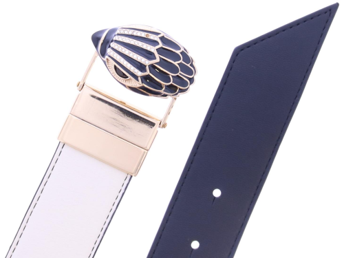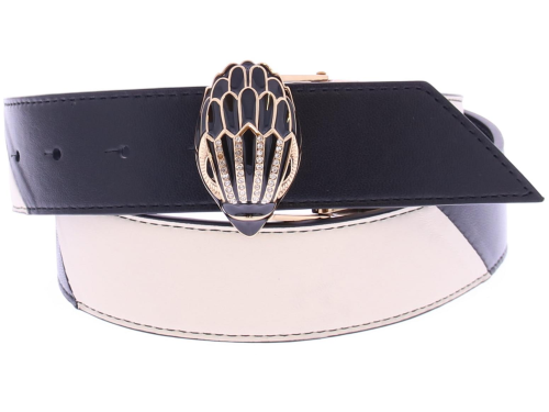 Zwart wit leren dames riem van het merk Kurt Geiger. Deze Kensington riem heeft een combinatie van zwart en wit leer. De antieke koperen adelaarskop is voorzien van zwarte kristallen en sluit de riem. Verkrijgbaar in twee maten. Maat S/M: 3 cm (H), 104 cm (L) Maat M/L: 3 cm (H), 111 cm (L)