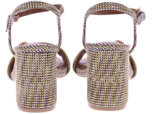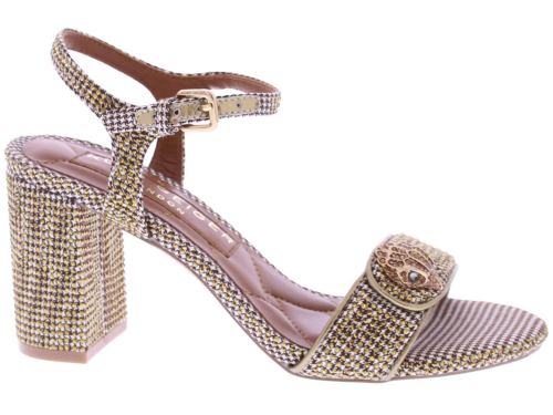 Goud leren met stoffen dames sandaal van Kurt Geiger. Deze sandaal is uitgevoerd met een brede band op de voorvoet met de bekende gouden adelaarskop. Het vertelbare bandje heeft een gouden gespje. De blokhak heeft een hoogte van 7 cm en de zool is van rubber.