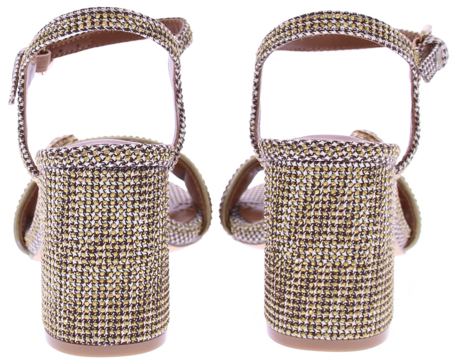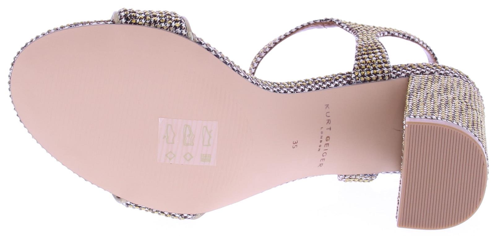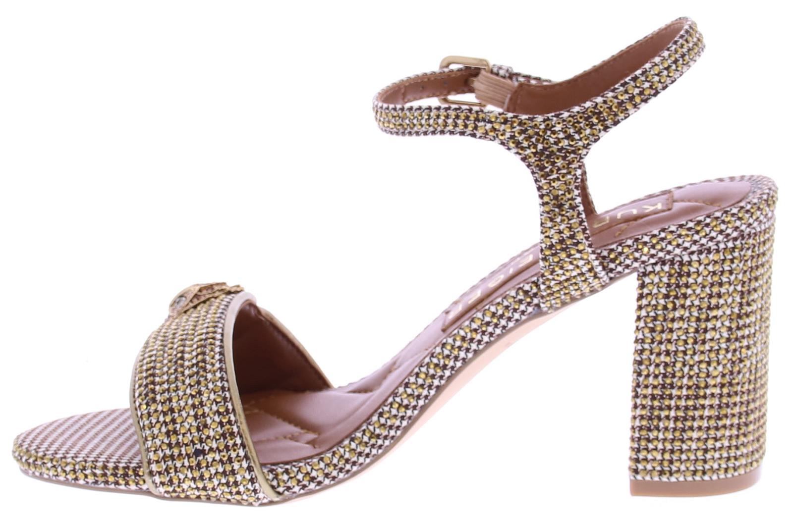 Goud leren met stoffen dames sandaal van Kurt Geiger. Deze sandaal is uitgevoerd met een brede band op de voorvoet met de bekende gouden adelaarskop. Het vertelbare bandje heeft een gouden gespje. De blokhak heeft een hoogte van 7 cm en de zool is van rubber.