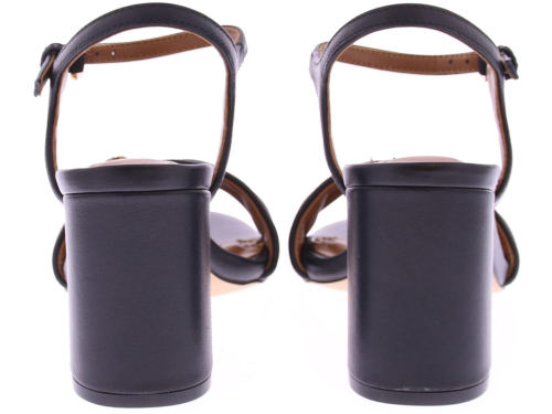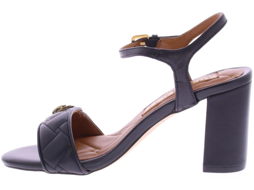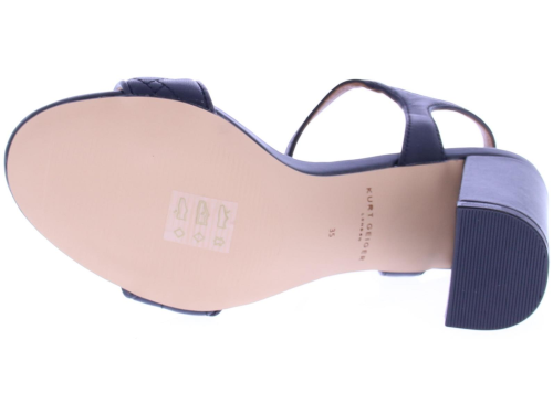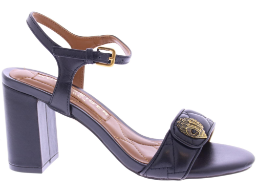 Zwart leren dames sandaal van Kurt Geiger. Deze sandaal is uitgevoerd met een doorgestikte brede band over de voorvoet met de bekende gouden adelaarskop. Het vertelbare bandje heeft een gouden gespje. De blokhak heeft een hoogte van 7 cm en de zool is van rubber.
