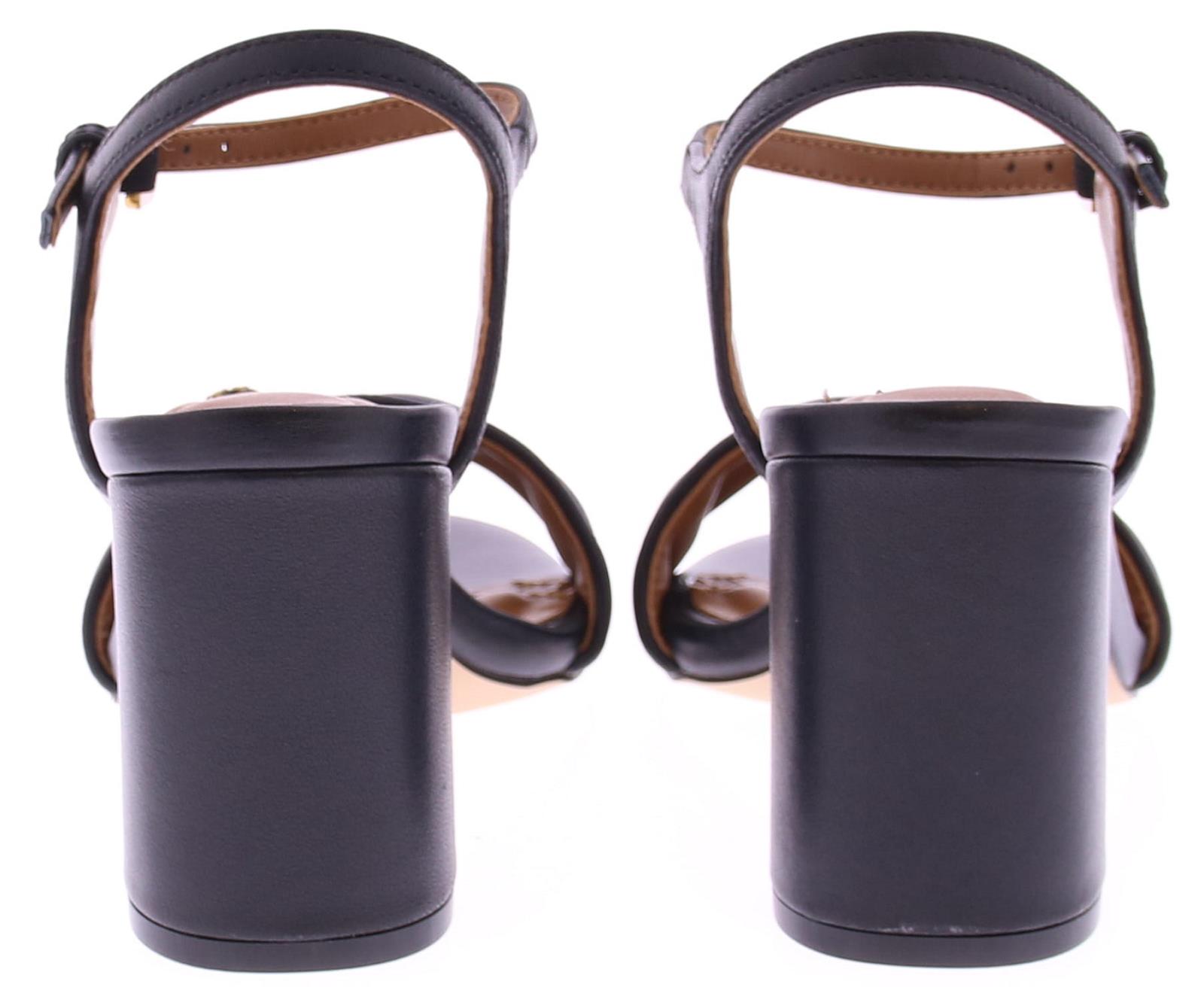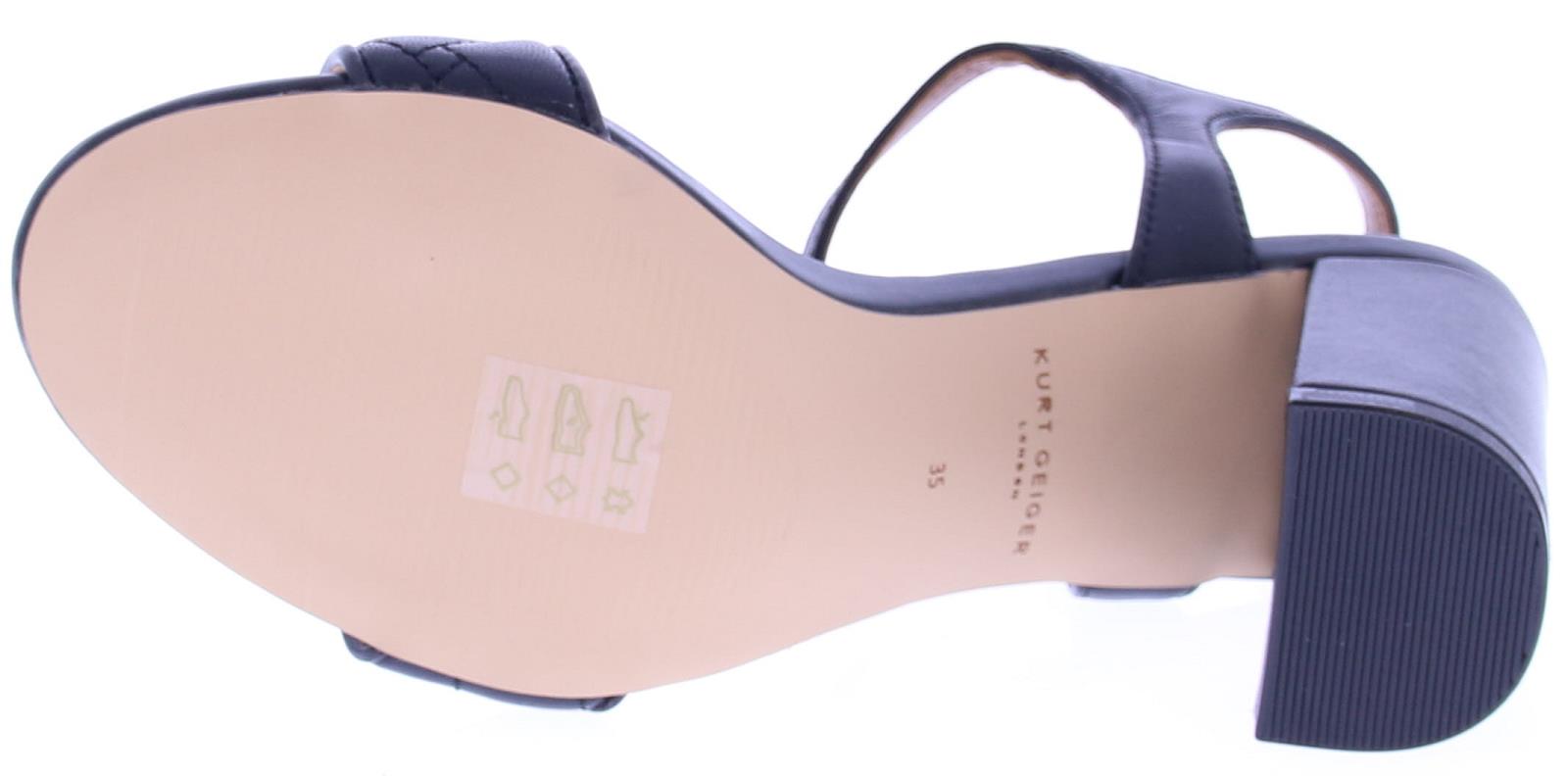 Zwart leren dames sandaal van Kurt Geiger. Deze sandaal is uitgevoerd met een doorgestikte brede band over de voorvoet met de bekende gouden adelaarskop. Het vertelbare bandje heeft een gouden gespje. De blokhak heeft een hoogte van 7 cm en de zool is van rubber.