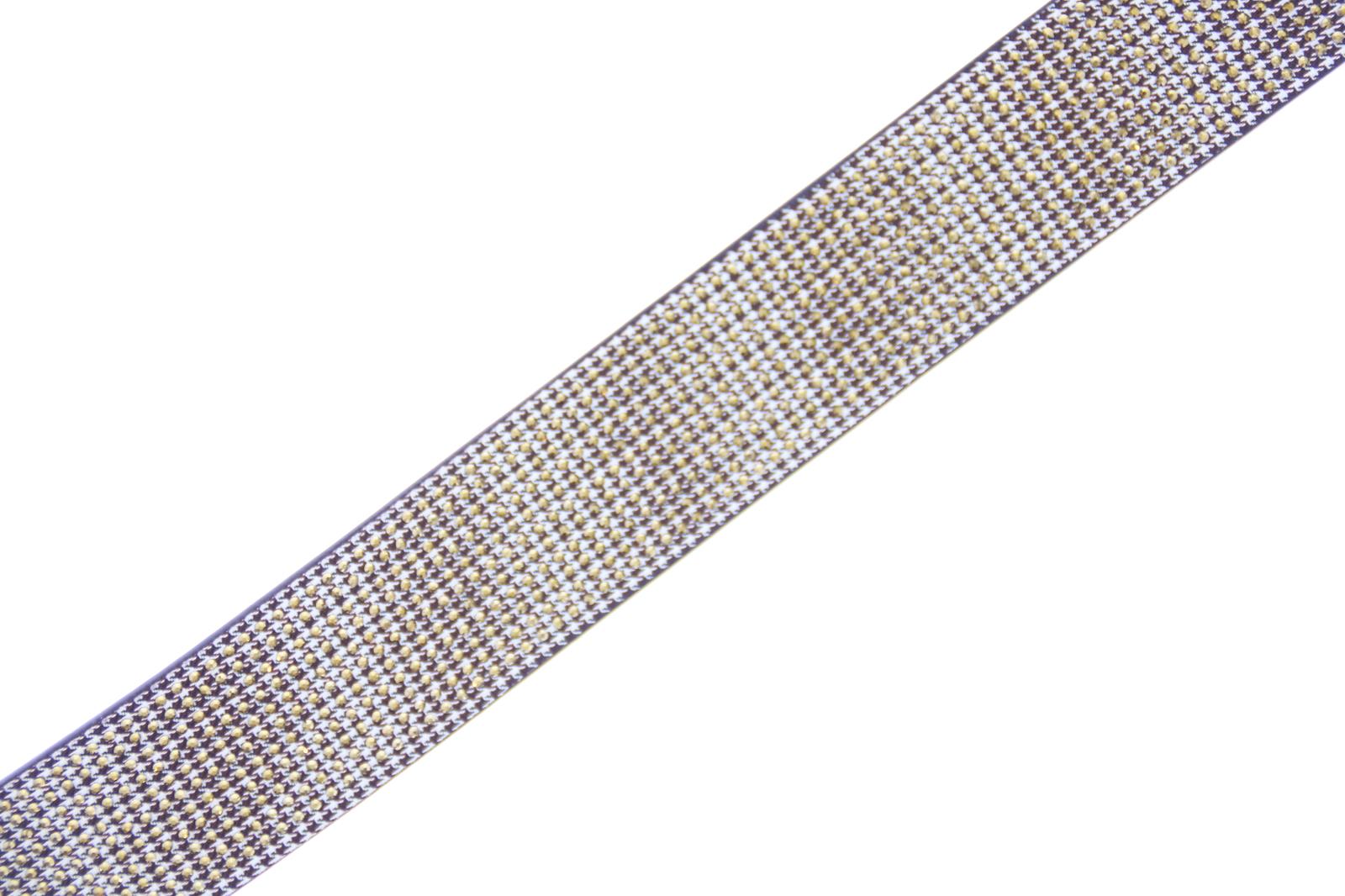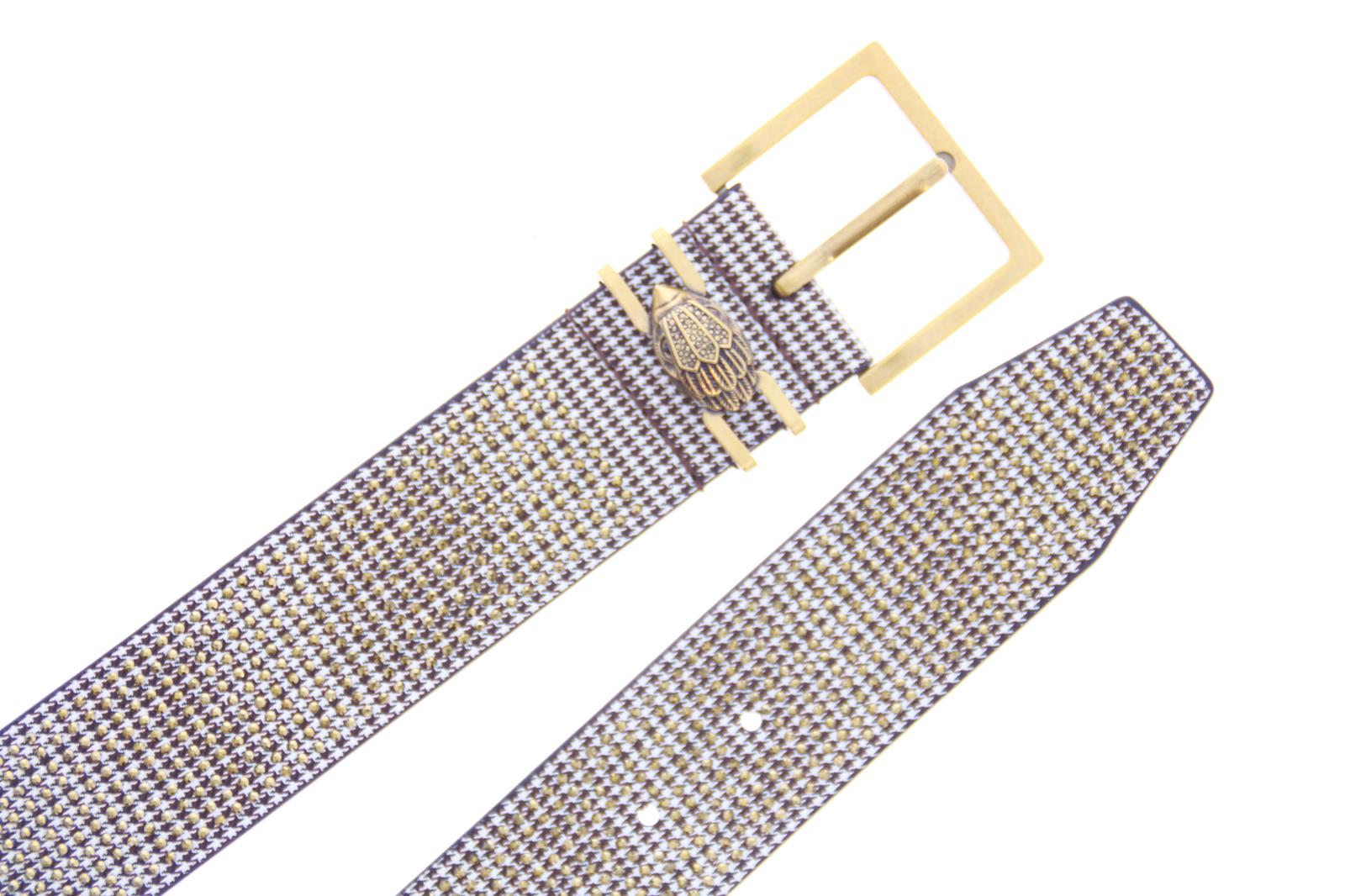Goudkleurige dames riem van het merk Kurt Geiger. Deze Kensington riem heeft een pied-de-poule-print met kristallen, en een goudkleurige gesp. De antieke koperen adelaarskop is voorzien van kristallen. Verkrijgbaar in twee maten. Maat S/M: 3 cm (H), 104 cm (L) Maat M/L: 3 cm (H), 111 cm (L)