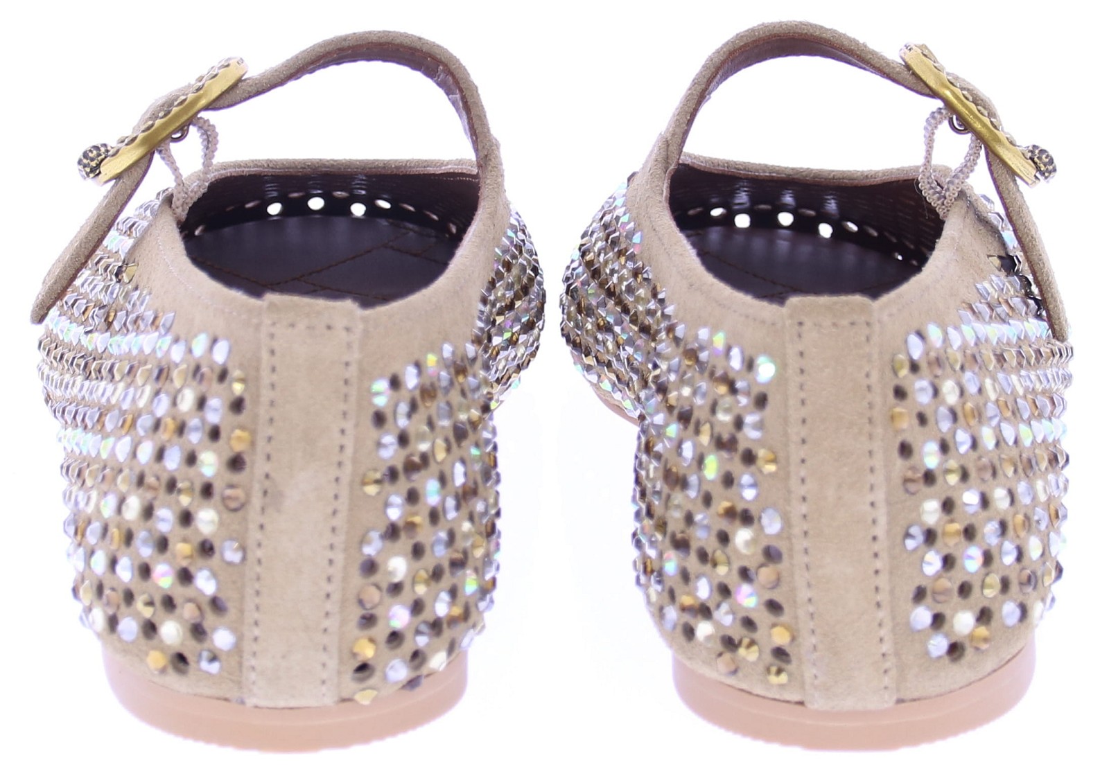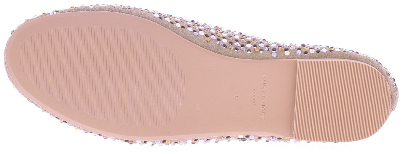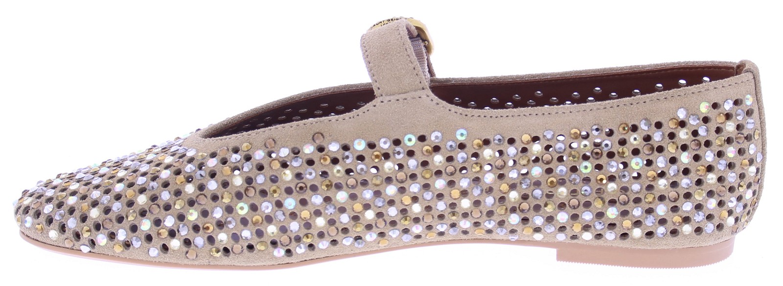 Beige suede ballerina voor dames van Kurt Geiger. De ballerina's zijn gemaakt van suéde met rondom strass stenen. Aan de bovenzijde is een bandje met een goudkleurige gesp met daarop het welbekende aadelaarshoofd.