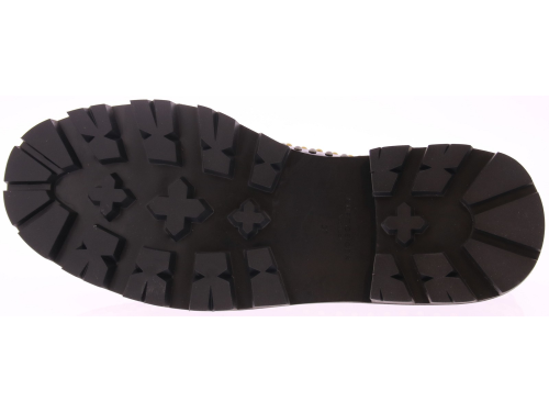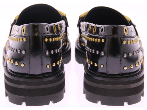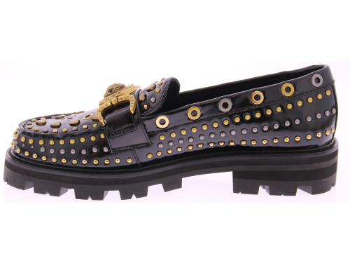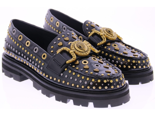 Zwart leren dames instapper van Kurt Geiger. Deze opvallende instapper van Kurt Geiger is een echte eyecatcher. Gemaakt van glanzend zwart lakleer en rijkelijk versierd met gouden en zilverkleurige studs, hartvormige details en metalen oogjes. De schoen heeft een stevige profielzool voor extra grip en comfort. De goudkleurige gesp met het iconische adelaarsembleem op de wreef maakt het ontwerp helemaal af. Een gedurfde statement loafer voor wie durft op te vallen.