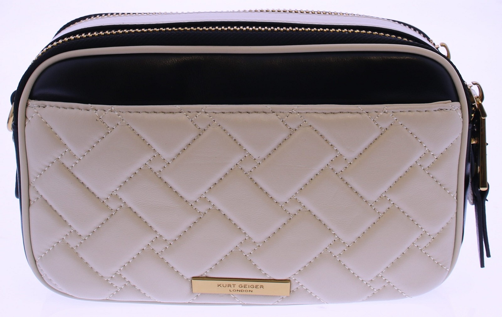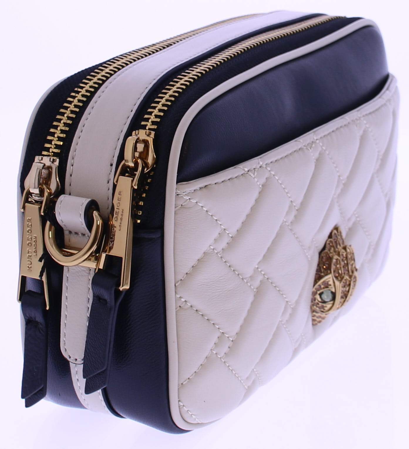 Dames zwart wit leren camera bag van Kurt Geiger. Deze Kensington-tas is gemaakt van een combinatie van zwart en wit leer. De antieke koperen adelaarskop is voorzien van kristallen. De tas sluit door middel van een duo ritssluiting. De afmetingen van de tas zijn 14 cm (H), 20 cm (L), 6 cm (D). De leuke zwart witte crossbody band is 136 cm.