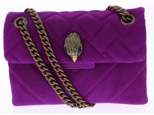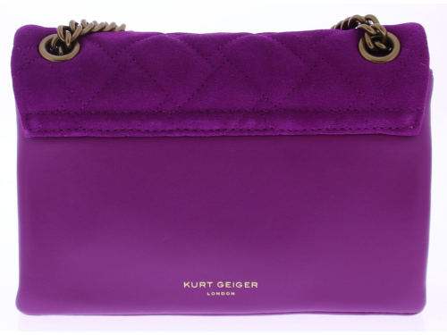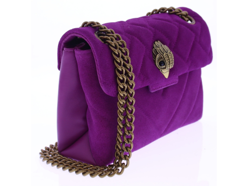 Fuchsia suède dames tas van Kurt Geiger. De Mini Kensington Bag is een elegant en luxueus accessoire, vervaardigd uit suède met een doorgestikt ontwerp dat geweven en chevronpatronen combineert. De iconische adelaarskop op de voorflap. De verouderde kettingriem van 123 cm biedt een stijlvolle crossbody-optie, terwijl de magnetische drukknoopsluiting discreet onder de flap verborgen zit. De buitenkant is gemaakt van hoogwaardig suède en leer.