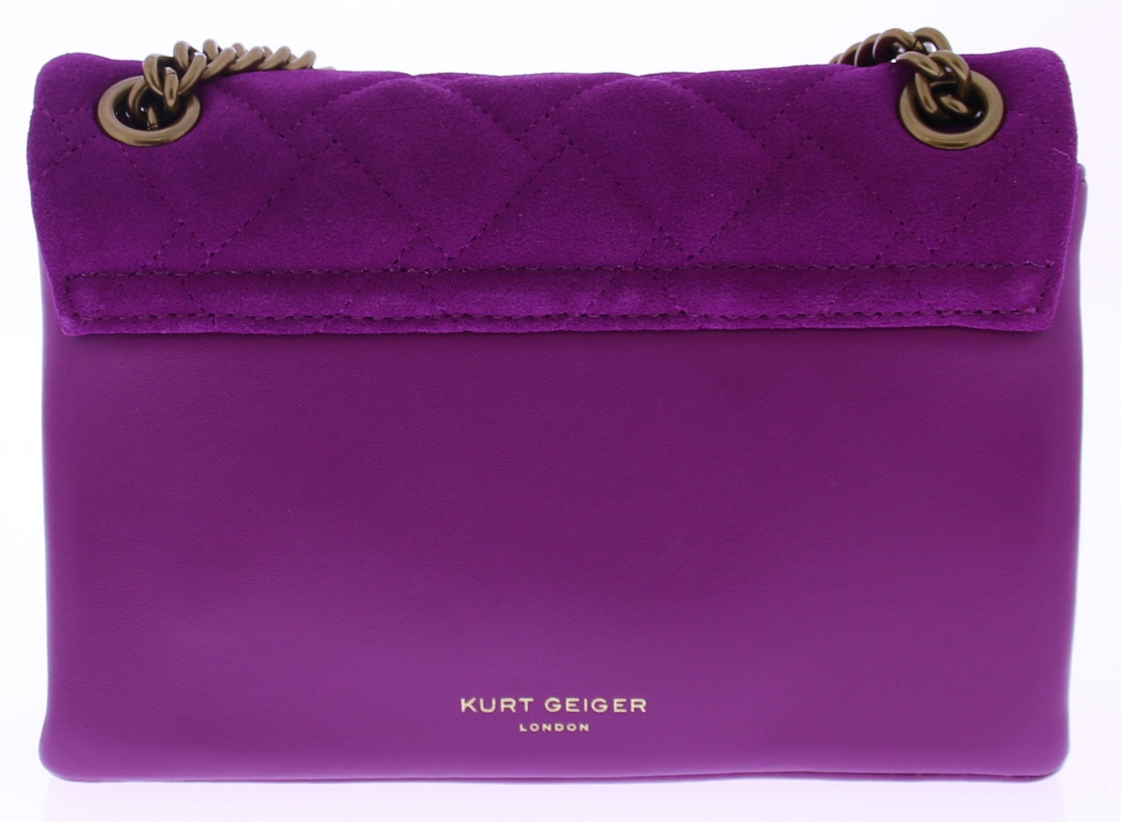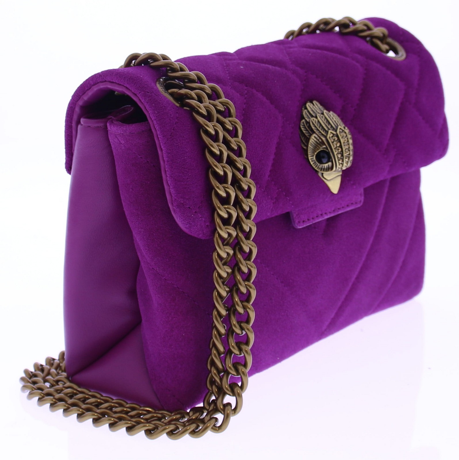 Fuchsia suède dames tas van Kurt Geiger. De Mini Kensington Bag is een elegant en luxueus accessoire, vervaardigd uit suède met een doorgestikt ontwerp dat geweven en chevronpatronen combineert. De iconische adelaarskop op de voorflap. De verouderde kettingriem van 123 cm biedt een stijlvolle crossbody-optie, terwijl de magnetische drukknoopsluiting discreet onder de flap verborgen zit. De buitenkant is gemaakt van hoogwaardig suède en leer.