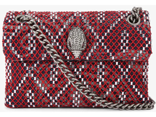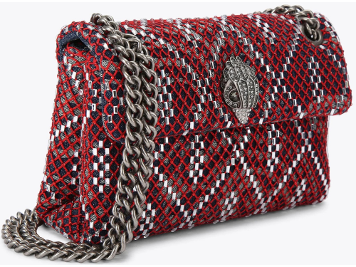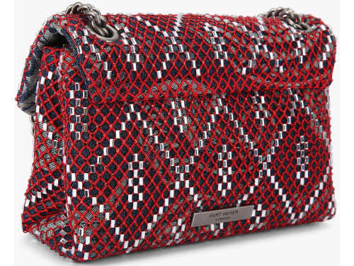 Denim stoffen dames tas met een rode netstructuur met kraaltjes van Kurt Geiger. De antiek zilverkleurige adelaarskop is voorzien van ondoorzichtige koperen kristallen met zwarte kraalogen en zit op de voorflap. De tas sluit door middel van een magneetknoop verborgen onder de voorklep. De afmetingen van de tas zijn 14 cm (H), 20cm (L), 6cm (D). De zilverkleurige ketting schouderband is 60 cm lang. Een perfecte tas voor zowel casual als chique gelegenheden.