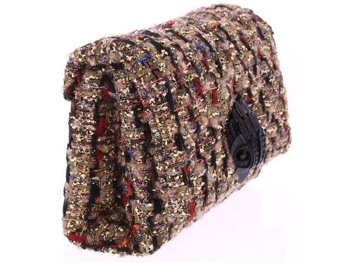 Deze stijlvolle Kurt Geiger tas voor dames is bekleed met een rijke, multikleurige bouclé stof met goud-, rood-, zwart- en paarstinten verweven in een luxe structuur. De grove textuur geeft de tas een chique en modieuze uitstraling, perfect voor zowel overdag als ‘s avonds. Op de voorkant prijkt het iconische zwarte adelaar-logo van Kurt Geiger, wat zorgt voor een elegante finishing touch. De goudkleurige kettingriem maakt het ontwerp compleet. Ideaal als statement accessoire voor een feestelijke look of om een eenvoudige outfit mee te upgraden. De afmetingen van de tas zijn 14 cm (H), 20cm (L), 6cm (D).