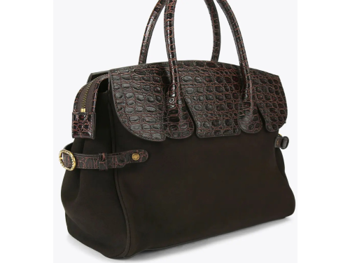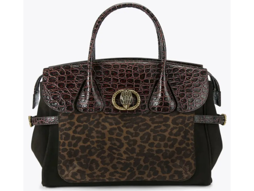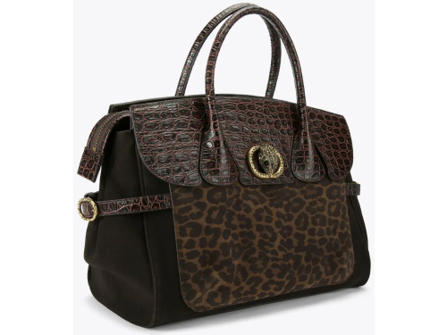 Deze chique Kurt Geiger handtas voor dames combineert luxe en karakter in één stijlvol ontwerp. De tas is uitgevoerd in donkerbruin suède met een leopardprint voorpaneel, afgewerkt met een klep en handvatten in glanzend croco-patroon. De combinatie van dierenprint en krokodillenlook zorgt voor een krachtige en modieuze uitstraling. De tas sluit met een flap voorzien van een goudkleurig Kurt Geiger embleem met kroon, en biedt voldoende ruimte voor dagelijks gebruik. Perfect voor wie houdt van klassieke elegantie met een stoer randje. Afmetingen 27cm (H), 36cm (L), 16cm (D)