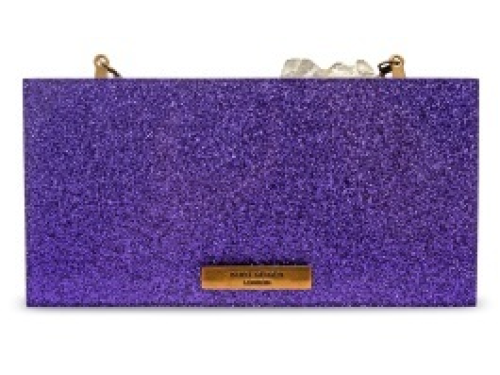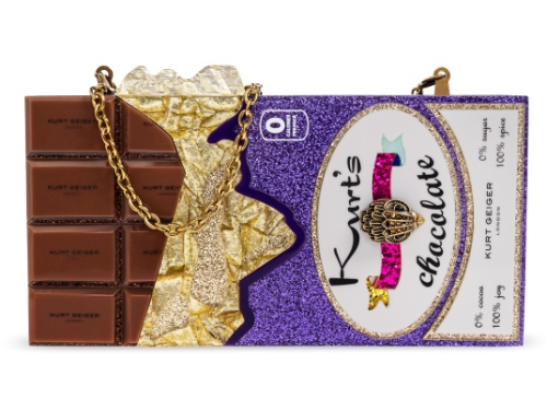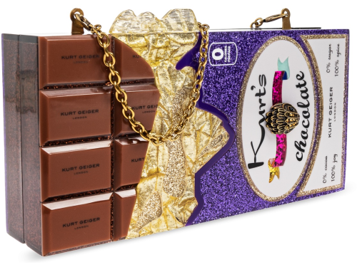 Dit Kurt Geiger tasje is een echte showstopper. Vormgegeven als een luxe chocoladereep, gemaakt van stevig glanzend kunststof in rijke kleuren zoals paars, goud en bruin. Op de zijkant zie je realistische ‘reepjes’ met het Kurt Geiger-logo, terwijl de voorkant versierd is met een grote gouden strik en speelse teksten zoals “Kurt’s chocolate – 0% sugar, 100% joy”. De tas heeft een gouden kettingriem en is groot genoeg voor je essentials tijdens een avondje uit of een bijzonder event. Een unieke clutch voor wie durft op te vallen. 19cm x 10 cm x 4,5 cm.
