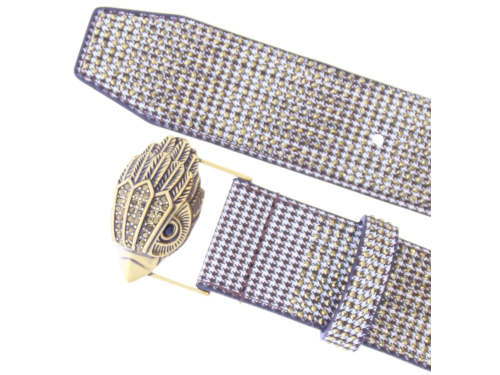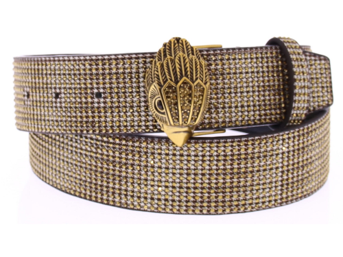 Goudkleurige dames riem van het merk Kurt Geiger. Deze Kensington riem heeft een pied-de-poule-print met kristallen aan de buitenkant de binnenkant is gemaakt van zwart leer. De antieke koperen adelaarskop is voorzien van kristallen en sluit de riem. Verkrijgbaar in 3 maten. Maat S/M: 4 cm (H), 104 cm (L) Maat M/L: 4 cm (H), 110 cm (L) Maat L/XL: 4 cm (H), 114 cm (L)