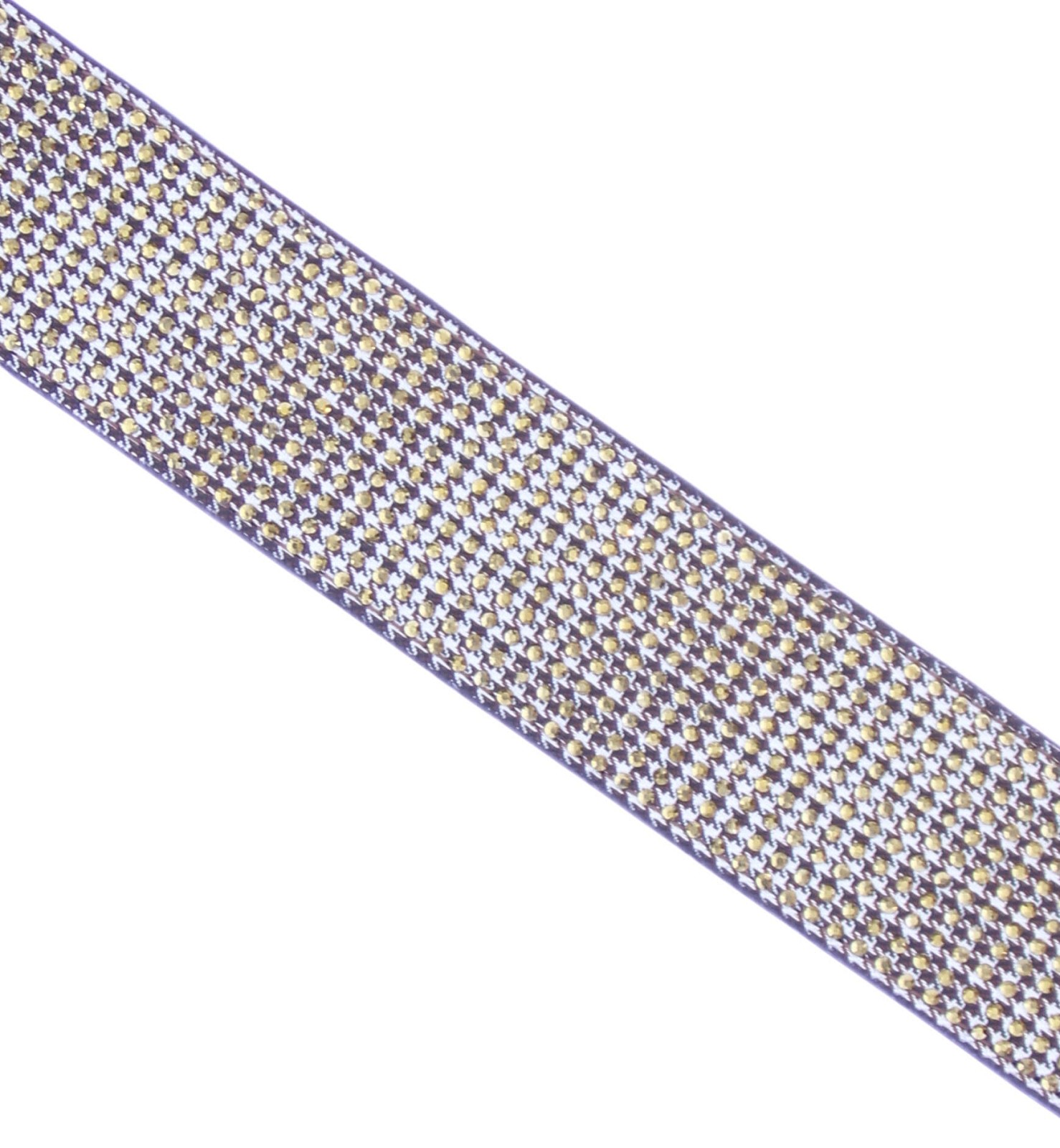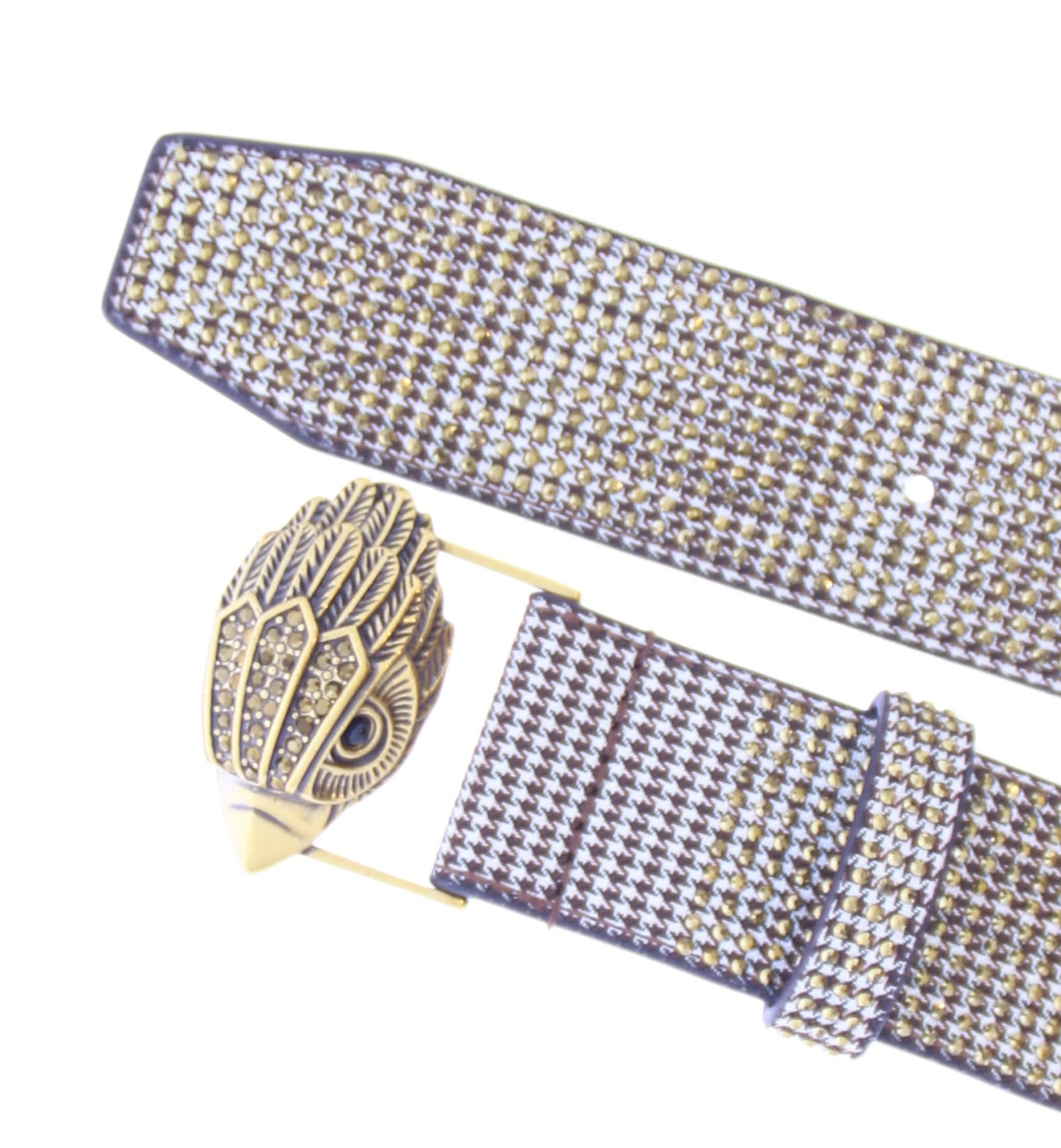 Goudkleurige dames riem van het merk Kurt Geiger. Deze Kensington riem heeft een pied-de-poule-print met kristallen aan de buitenkant de binnenkant is gemaakt van zwart leer. De antieke koperen adelaarskop is voorzien van kristallen en sluit de riem. Verkrijgbaar in 3 maten. Maat S/M: 4 cm (H), 104 cm (L) Maat M/L: 4 cm (H), 110 cm (L) Maat L/XL: 4 cm (H), 114 cm (L)