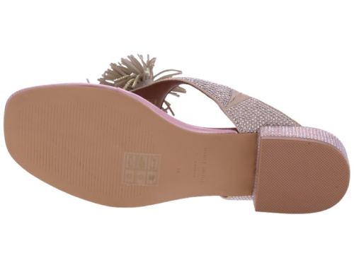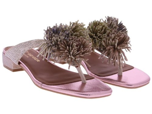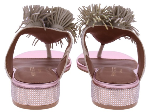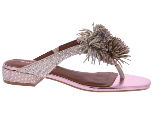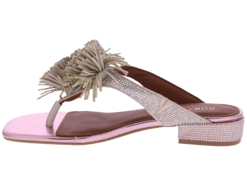 Multikleurige leren dames slipper van Kurt Geiger, model Pom Pom T-bar Flat SDL. Deze vrouwelijke teenslipper combineert speels design met zomerse elegantie. De platinakleurige bandjes en decoratieve pom poms zijn rijkelijk versierd met fijne mini strassteentjes. De lage hak van 2 cm biedt comfortabel draaggemak, ideaal voor zomerse dagen en feestelijke momenten. Ontdek ook de andere dames slippers van Kurt Geiger bij Klijsen.