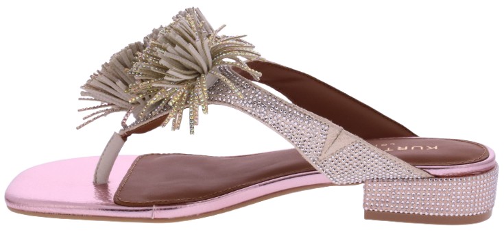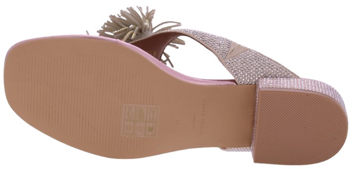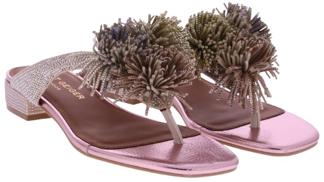Multikleurige leren dames slipper van Kurt Geiger, model Pom Pom T-bar Flat SDL. Deze vrouwelijke teenslipper combineert speels design met zomerse elegantie. De platinakleurige bandjes en decoratieve pom poms zijn rijkelijk versierd met fijne mini strassteentjes. De lage hak van 2 cm biedt comfortabel draaggemak, ideaal voor zomerse dagen en feestelijke momenten. Ontdek ook de andere dames slippers van Kurt Geiger bij Klijsen.