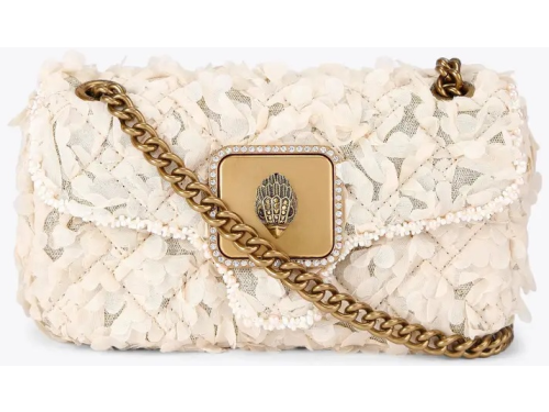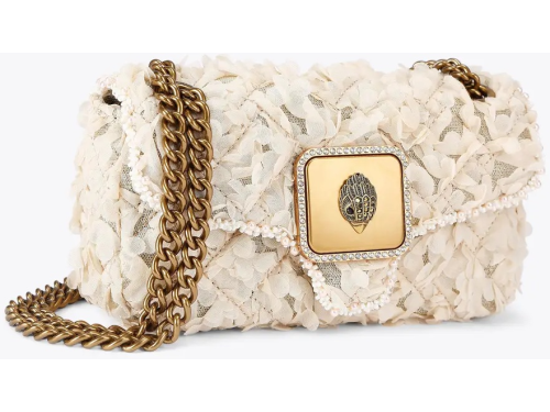 Beige dames tas van Kurt Geiger, model Mini Pimlico. Deze compacte tas is uitgevoerd in een gestructureerde stof met verfijnde imitatieparels en heeft twee aparte compartimenten. De antiek messing adelaarskop op de voorzijde en de bijpassende kettingschouderband geven het ontwerp een luxe uitstraling. Voorzien van een plat open vak aan de achterkant en een binnenvak met rits. Afmetingen: 12 x 21 x 6 cm, geschikt voor telefoons tot 15 cm. Kijk ook eens bij onze andere Kurt Geiger schoenen en accessoires.