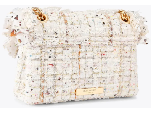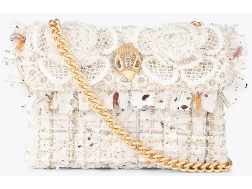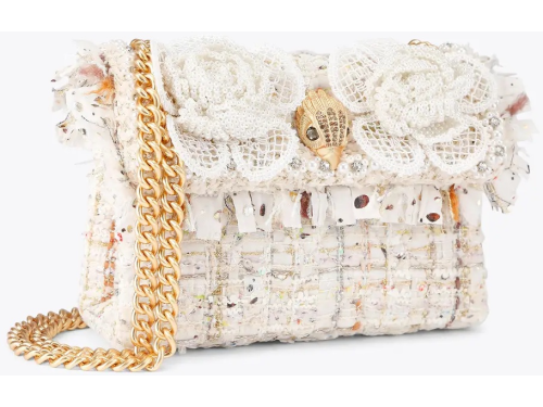 Roomkleurige tweed dames schoudertas van Kurt Geiger, model Mini Kensington Tweed Mini Bone. Deze compacte tas is uitgevoerd in luxe tweed en rijkelijk afgewerkt met verfijnde details en met de kenmerkende goudkleurige adelaarskop op de klep. De goudkleurige ketting zorgt voor een elegante uitstraling en kan comfortabel crossbody worden gedragen. De tas sluit met een verborgen magneetsluiting.Afmetingen 20 breed, 14 hoog en 7 diep. Een stijlvolle keuze voor feestelijke gelegenheden of een zomerse outfit. Ontdek ook de andere Kurt Geiger tassen bij Klijsen.