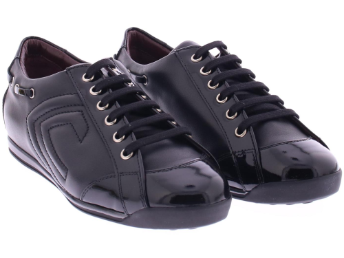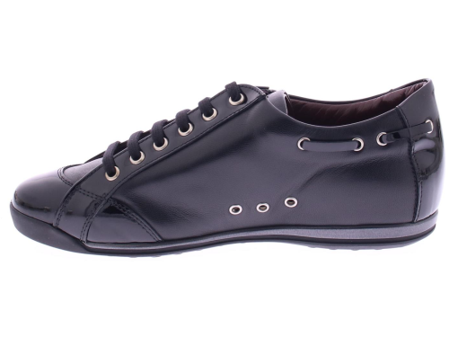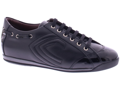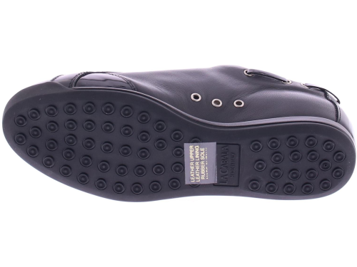 Zwart leren dames sneaker van La Cabala. Uitgevoerd in het bekende superzachte kalfsleer in combinatie met lakleer op de neus, hiel en langs de veter. Het voetbed van de elegante sneakers is uitneembaar.